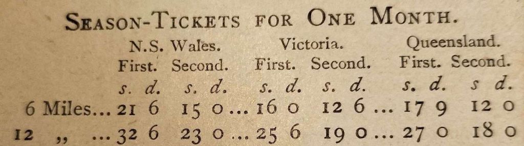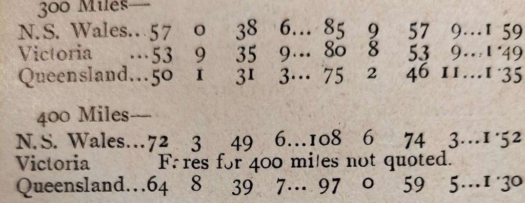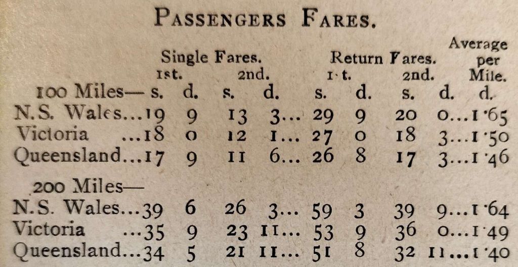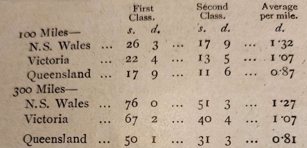 ‘Rebus’ says that, “it will be observed that the ordinary fares in Queensland are very much lower per mile than in either of the other two colonies. In the case of holiday excursion fares the difference is even more favourable to Queensland, the figures being:” [1: p424]