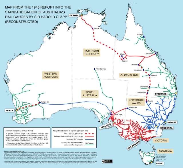 “After the Second World War a report on uniformity of railway gauges was commissioned from former Victorian Railways Chief Commissioner Harold Clapp for the Commonwealth Land Transport Board. The report produced three main recommendations: