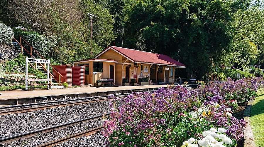 Queensland Railways train at Spring Bluff Station [1: p420]Spring Bluff Railway Station in 2024. Spring Bluff is best known for its heritage listed Railway Station, in the Spring Bluff valley tucked into the ranges north of Toowoomba. Spring Bluff Railway State is a favourite day trip for visitors, with the landscaped gardens and steam train rides attracting thousands for the spring exhibit during Toowoomba Carnival of Flowers. [14]