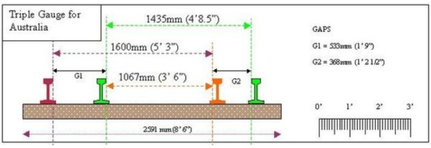 By 1899, the lengths of each gauge open to public traffic were: 3ft 6in gauge, 5,280 miles; 5ft 3in gauge, 3,615 miles; and 4 f. 8 1⁄2in gauge, 2,531 miles. It was obvious to ‘Rebus’ that “to convert all lines to the 3 ft. 6 in. gauge would cost the community less in money, in time, and in public inconvenience than to adopt either of the other two. To alter the 4 ft. 8 1⁄2in. to 5 ft. 3 in. (which is the next important as regards mileage) would not be attended with insuperable difficulties, and it would have one substantial advantage, viz., that the rolling-stock of the 4 ft. 8 1⁄2in. gauge could be readily disposed of, whereas the 5 ft. 3 in. rolling-stock, if discarded would be a comparative drug on the market; but 5 ft. 3 in. as the uniform gauge would be decidedly objectionable, seeing it [was] all but obsolete. The question, so far as Australia [was] concerned, therefore reduces itself to 4 ft. 8 1⁄2in. or 3 ft. 6 in.” [1: p420]
