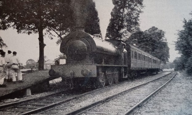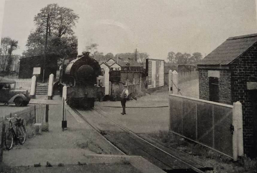 A passenger service managed by a WD Austerity 0-6-0ST crossing the road at ‘ Village Crossing’, approaching the eastern platform of the station, in the later days of the passenger service. [5: p244]