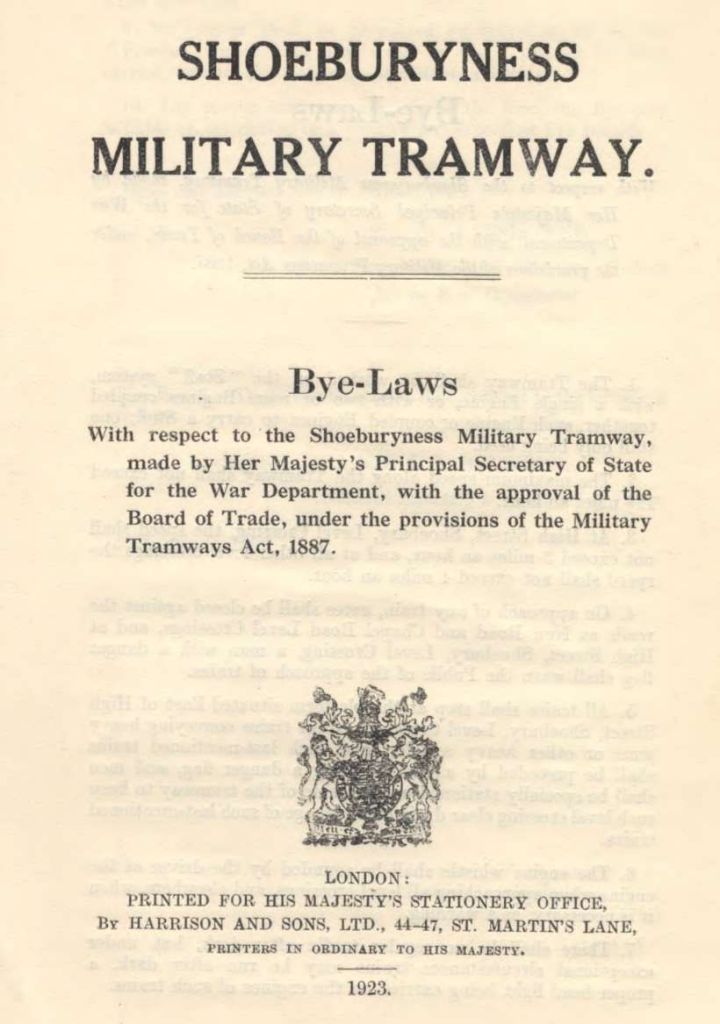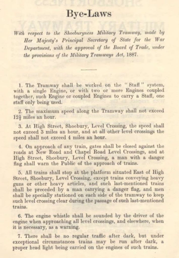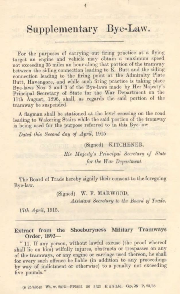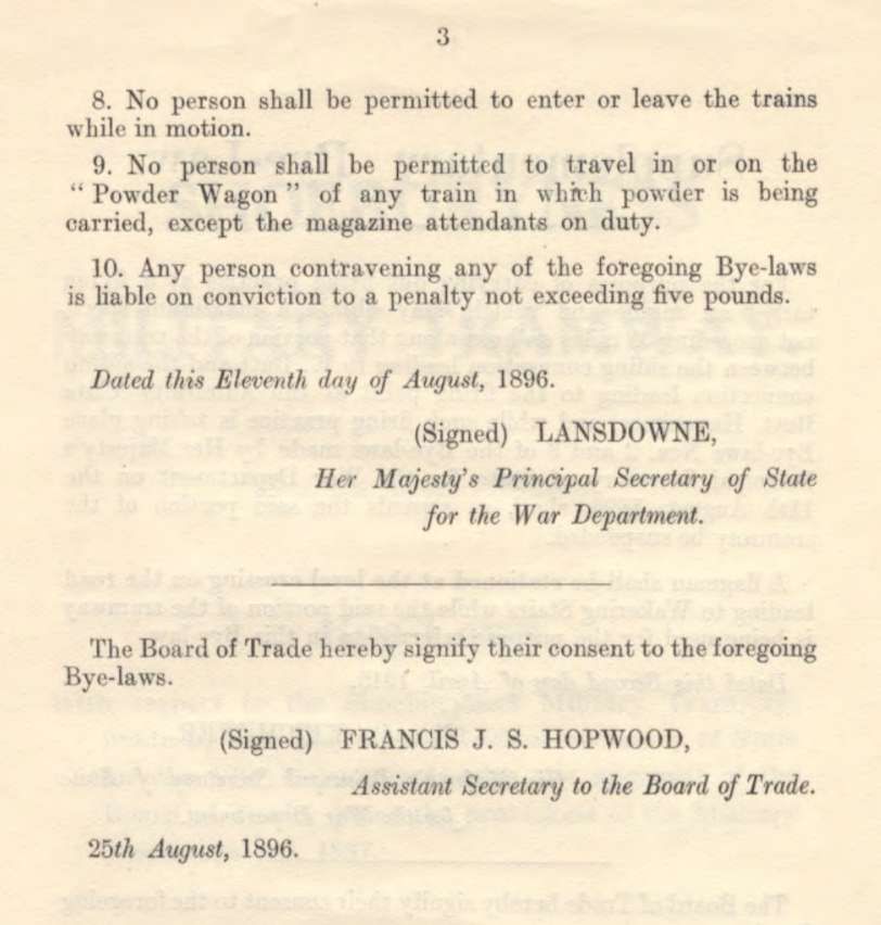 Military standing orders for train working, which correspond to the rule book in normal railway practice, incorporate the original bye-laws dated 11th August 1896, which were framed in compliance with the Act of 1887. Government Records [8] hold a copy of the bye-laws in place on the line. These bye-laws were promulgated by the War Department with the approval of the of Trade, under the provisions of the Military Tramways Act, 1887. Additional bye-laws were made in April 1915. The bye-laws are included immediately below. [8]