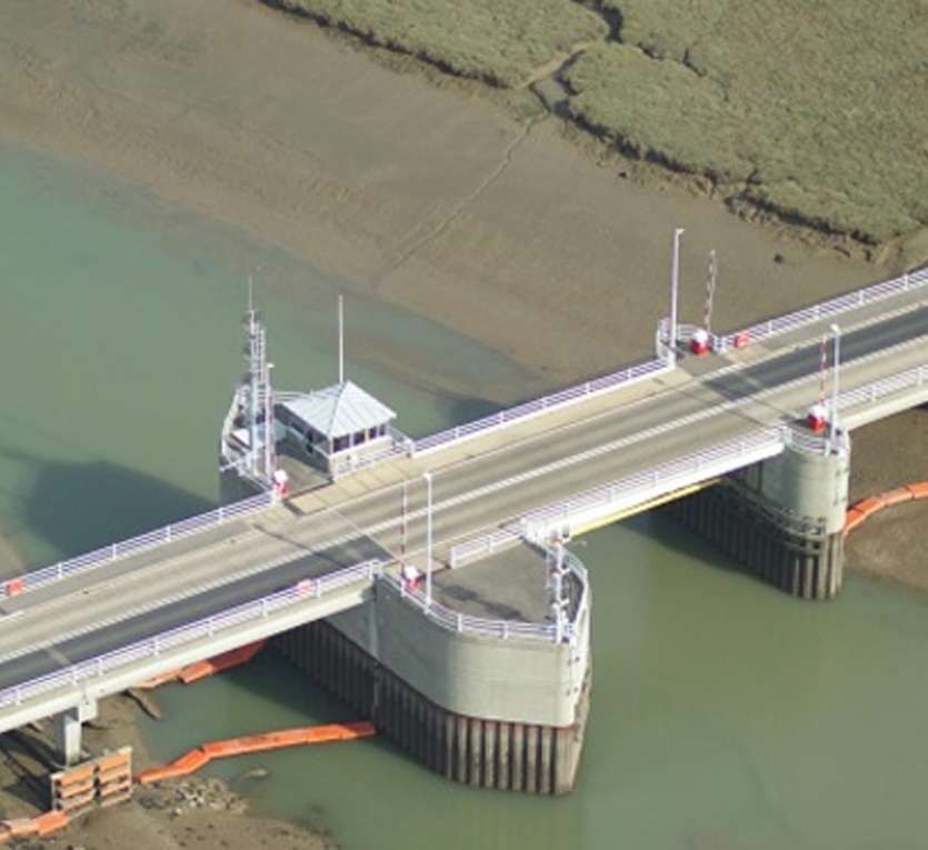 The Replacement Havengore Bridge was completed in 1988. It spans Havengore Creek and provides the only vehicle crossing point to Foulness Island. No provision for a tramway was made in the design of the bridge. [12] The bridge is a single leaf, counter-weighted bascule bridge raised by a pair of double acting hydraulic cylinders. [13]