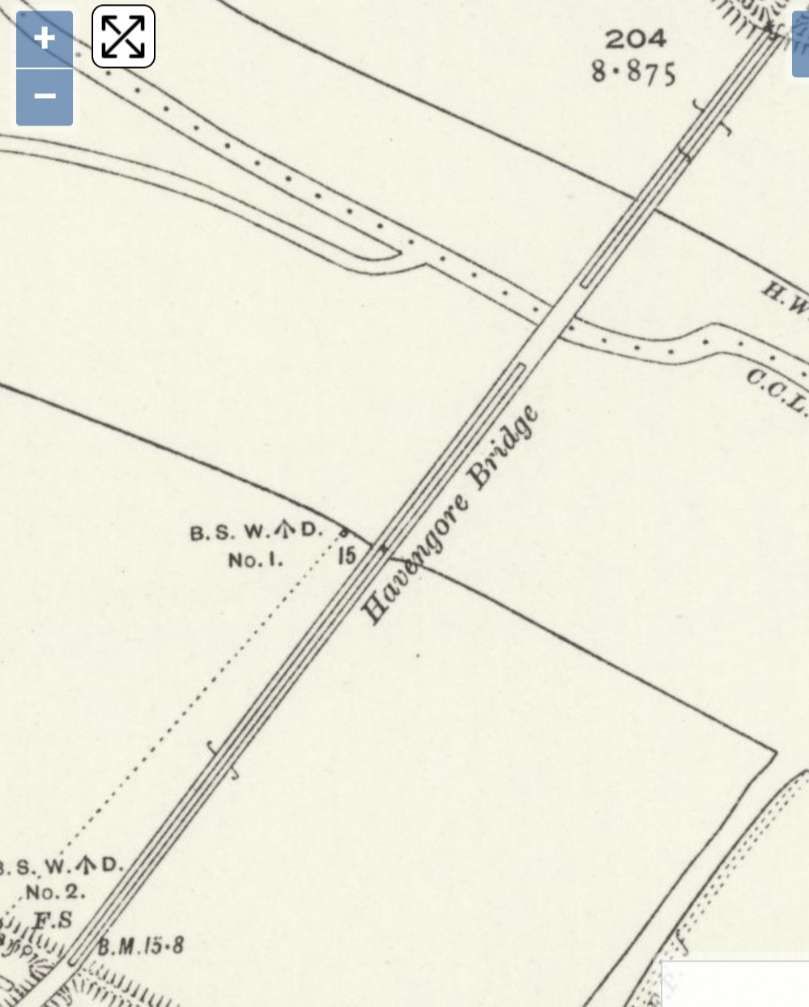 The bridge was shown on the 25″ Ordnance Survey of 1920/1921, published in 1923. However it was not connected to the standard-gauge military tramway network at this time. [23]
