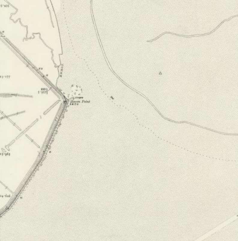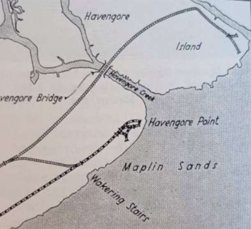 The line that once ran across Havengore e terminated towards the top of this map extractThe coastal line still terminated close to Havengore Point.