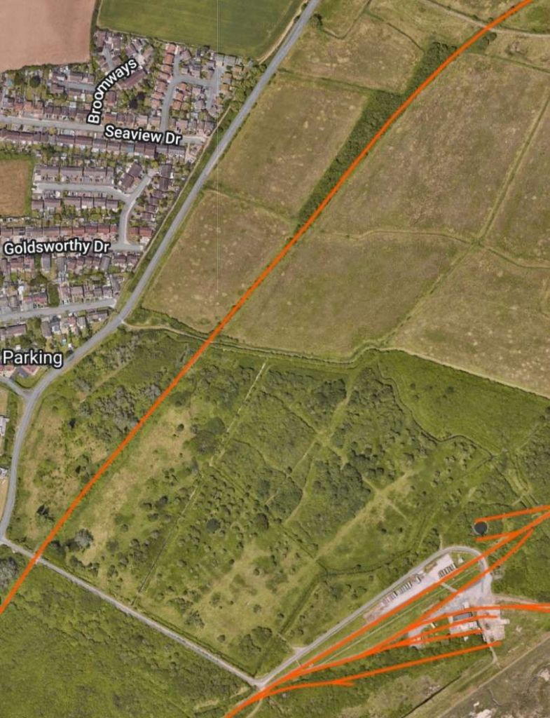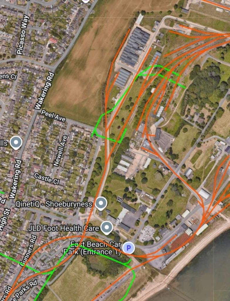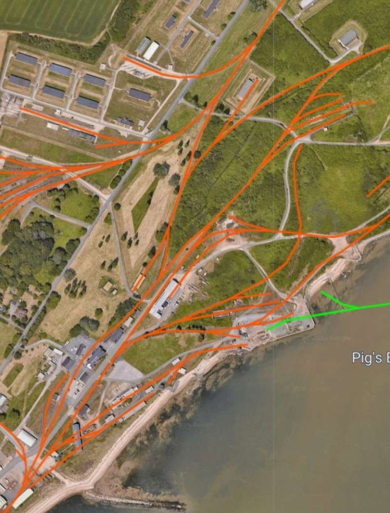 The next two satellite images cover approximately the same area as the three map extracts above. RailmapOnline.com seeks to show all the different track layouts which once graced the MOD site. It appears to be a ‘cats’ cradle’ of different lines! …