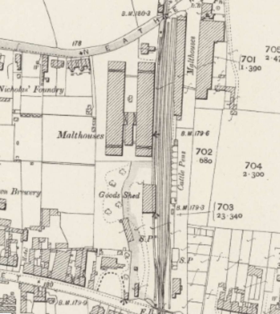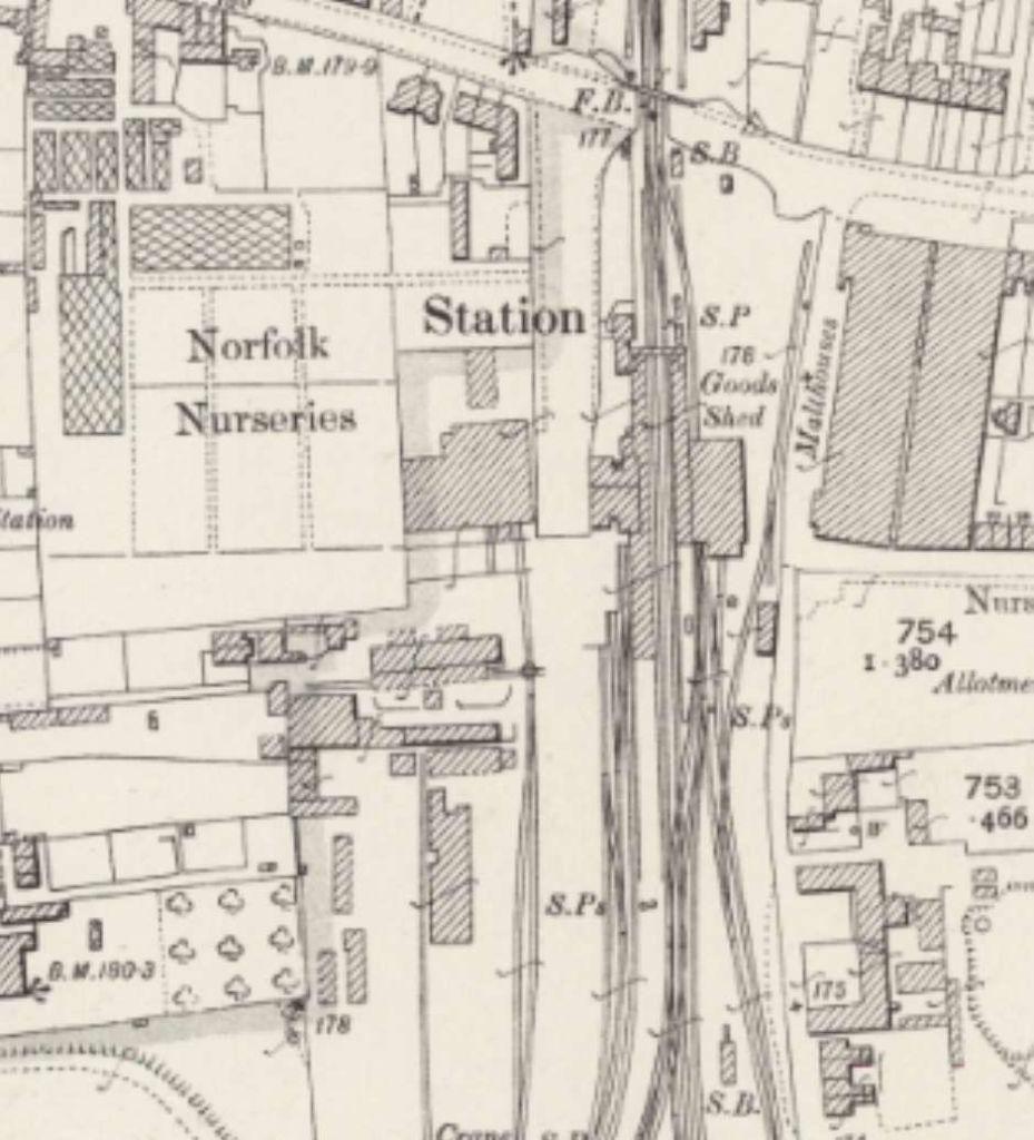 These three extracts from the 25″ Ordnance Survey of 1905, published in 1906, show the railway running North to South through Dereham. Southbound trains on the Wymondham & Wells Branch ran between the town’s Malthouses, crossed Norwich Street and entered the Railway Station. Goods facilities were close alongside the passenger station with the Goods Shed east of the main running lines. Further sidings sat to the West of the line before a triangular junction (including Motive Power Depot and turntable) gave access to lines running Southeast to Wymondham and Norwich and West to King’s Lynn. [2]