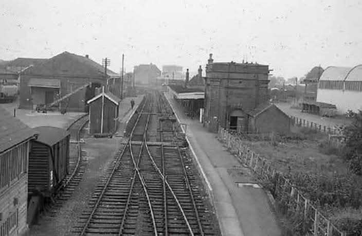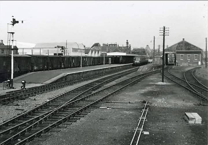Dereham Railway station looking South. The photograph was taken from the Norwich Road footbridge. The station footbridge is no longer present but Dereham Central No. 37 signal is visible against the gasometer at the far end of the station so the station is still open. The general.vondition of the station suggests a probable date between, 1965 and 1969. This image was shared on the Norfolk Orbital Railway Facebook Page on 30th January 2025, © Unknown. [4]