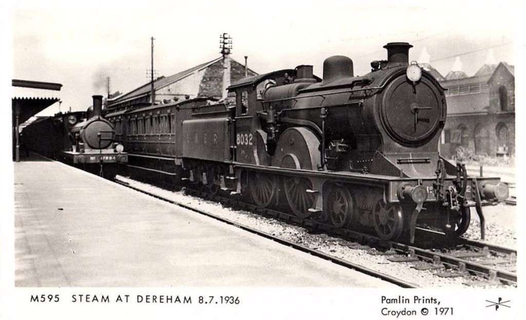 Looking Northeast from the Western platform at Dereham Station in July 1936. The locomotive which features on the centre-right of the photograph is LNER 4-4-0 locomotive No. 8032. The locomotive standing in the near platform is LNER Locomotive No. 7894. It was a member of the ex-GER J15 class of 0-6-0 freight and shunting locomotives. It was later renumbered as BR 65394. This image was shared on the Norfolk in Old Photographs and Postcards Facebook Group by Dave Johnston on 15th March 2025, © Pamlin Prints. [17]