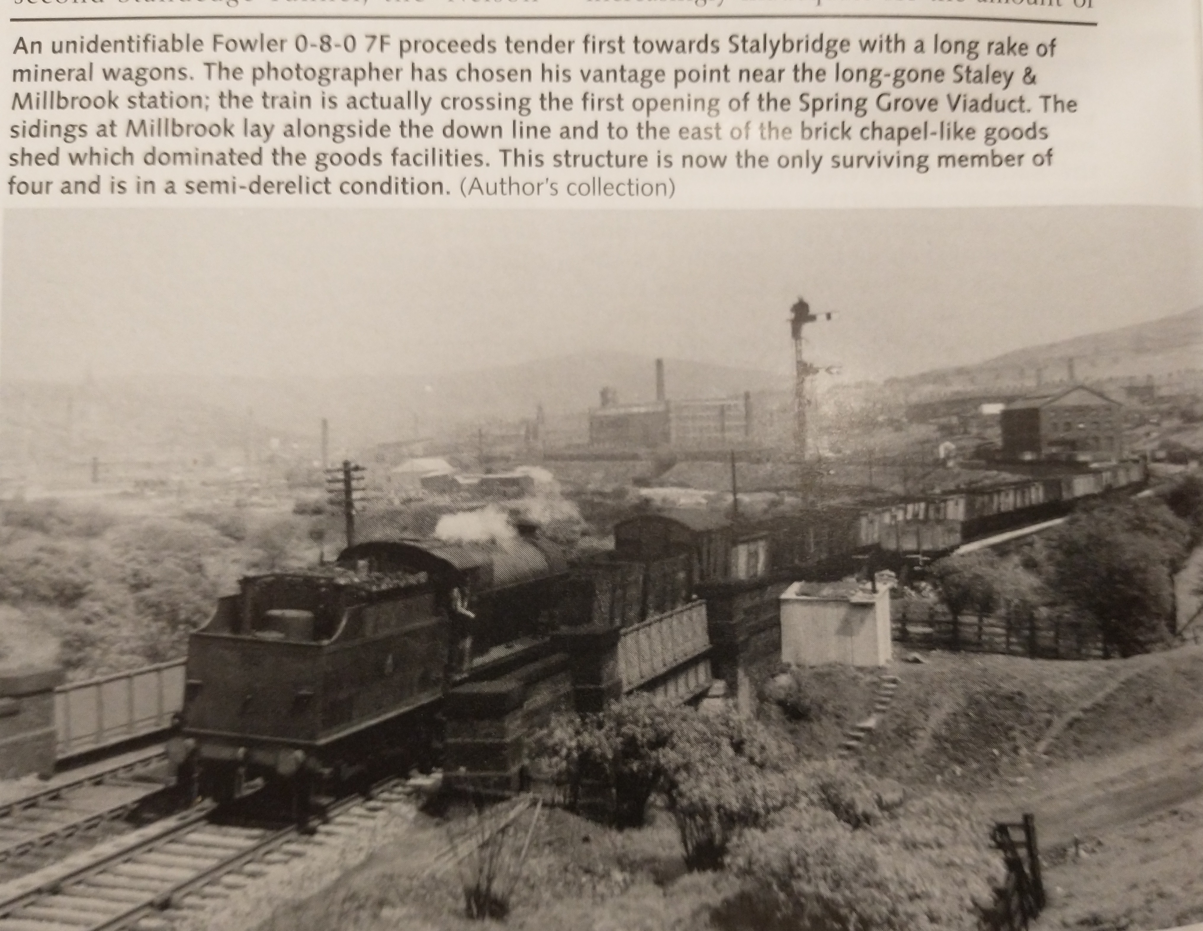 This excellent black and white study shows a Fowler 0-8-0 7F tender locomotive proceeding tender first towards Stalybridge. The caption above misidentifies the location. The goods shed visible on the right of the image is actually Micklehurst goods shed. It remains visible today on the site of a pallet works which occupies the old railway sidings. Two of these large goods sheds remain standing, this at Micklehurst and the one referred to in the caption above at Millbrook. As noted by Wells, the Millbrook shed was in a parlous state in 2021.