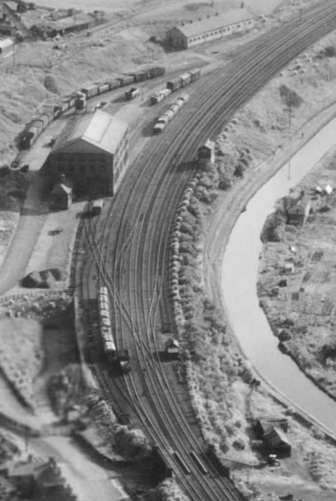 “The sidings were built in 1932 and had space to hold up to 130 12-ton wagons. Coal was fed into a hopper underneath the sidings before being transported on an enclosed conveyor belt which emerged high above the valley to cross the River Tame and canal before entering the station at a high level.” [4]