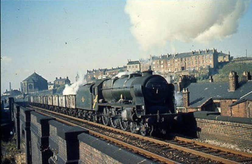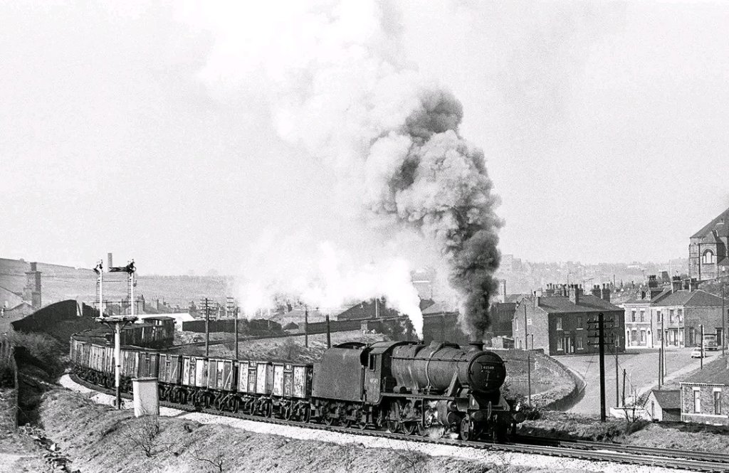 a northbound goods train passing the Goods Yard in the 1950s with a Stanier-designed Class 8F 2-8-0 locomotive No. 48552 in charge; and,