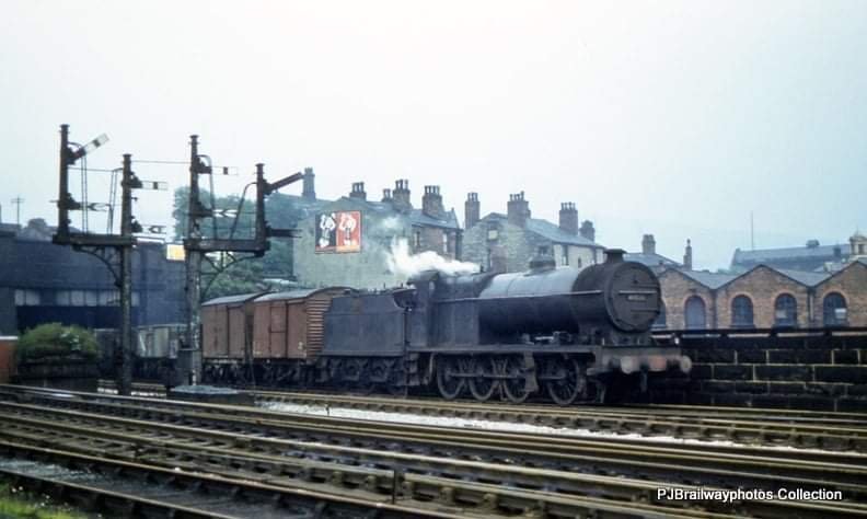 A southbound freight, also in the 1950s, pulled by a Fowler F7 0-8-0 locomotive No.49662. The mill in the background of this image is Brunswick Mill.