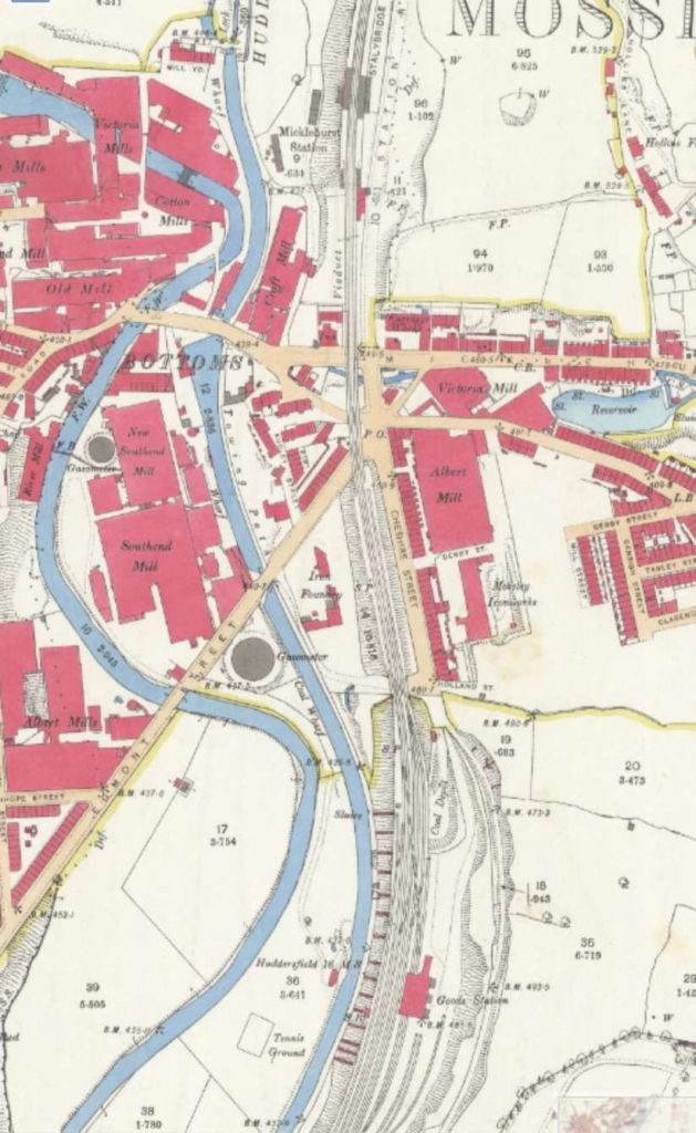 Mossley had a significant number of mills which we cannot cover in any detail in this article. However, Southend Mill, River Mill and Albert Mill also stood close to this length of the Loop Line and can be seen on the OS Map extracts on the opposite side of the Huddersfield Narrow Canal.