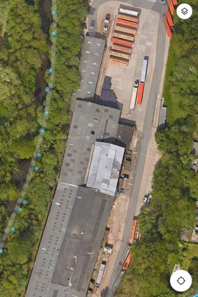 This coloured version of the 25″ Ordnance Survey of 1890/1891 was published in 1894. It shows Mossley’s stations on the Micklehurst Loop. At the top of the image the passenger station stands on embankment with the station building a little to the South on the East side of the line. The goods station which primarily consisted of the large goods shed is towards the bottom of the map extract. The railway and yard sit high above the Huddersfield Narrow Canal. [4]A closer satellite view of Plevin’s site in 2025 – this is the latest view of the site available on Google Maps. The lighter roof is that of the old goods shed the darker grey roofing is over later buildings built over the running lines of the Micklehurst Loop. [Google Maps, January 2025]The same buildings but this time as seen on Google Earth 3D imagery seen from the South. This is the current view on Google Earth at the beginning of 2025. [Google Earth 3D, January 2025]
