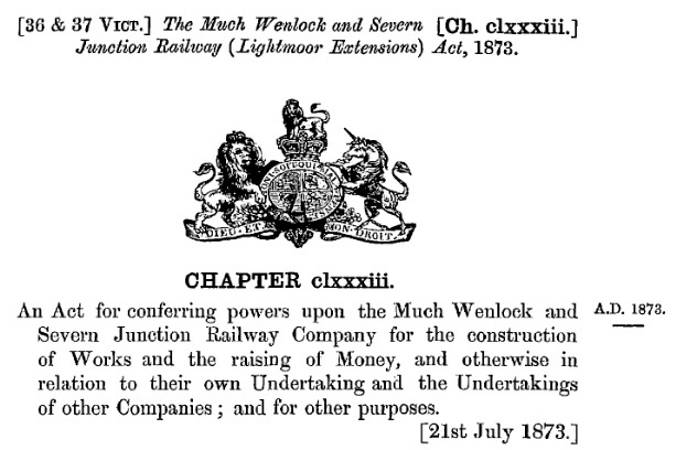 The “Much Wenlock and Severn Junction (Lightmoor Extensions) Act, got the Royal Assent on 21st July 1873. … The Wenlock companies had relied on the Coalbrookdale Company subscribing a substantial sum to the construction, but now that Company said that the downturn in the Shropshire iron trade meant that they could not do so. There was now no possibility of making the new line.” [1][2: p65-66]