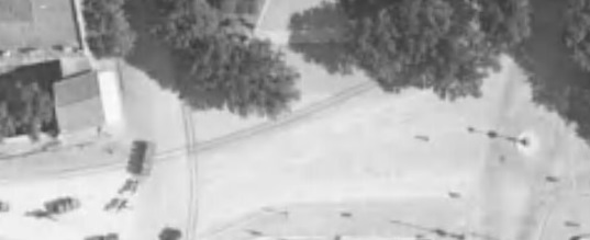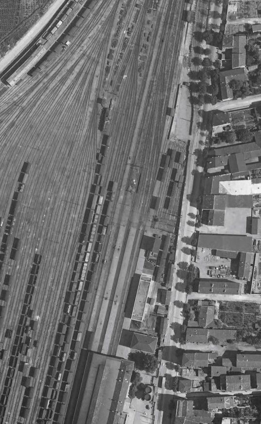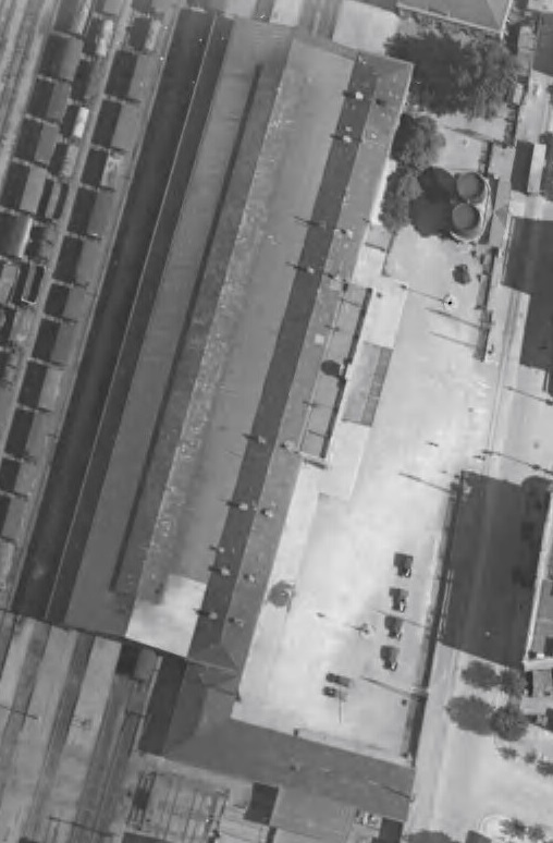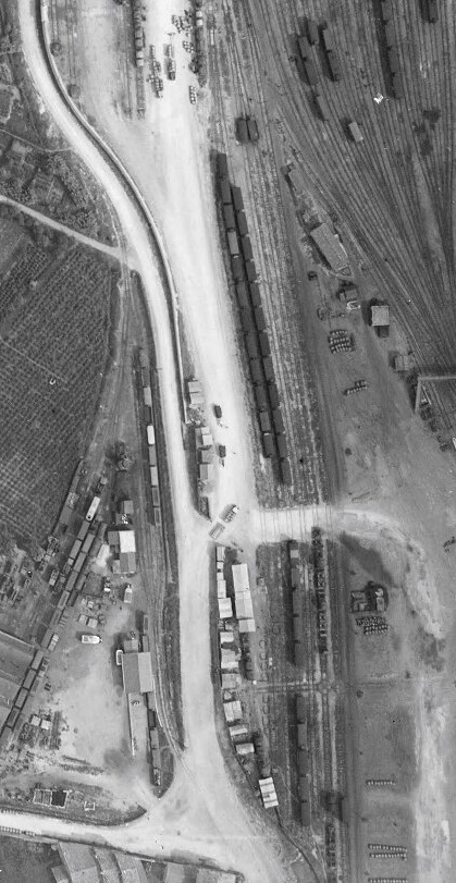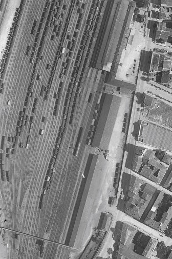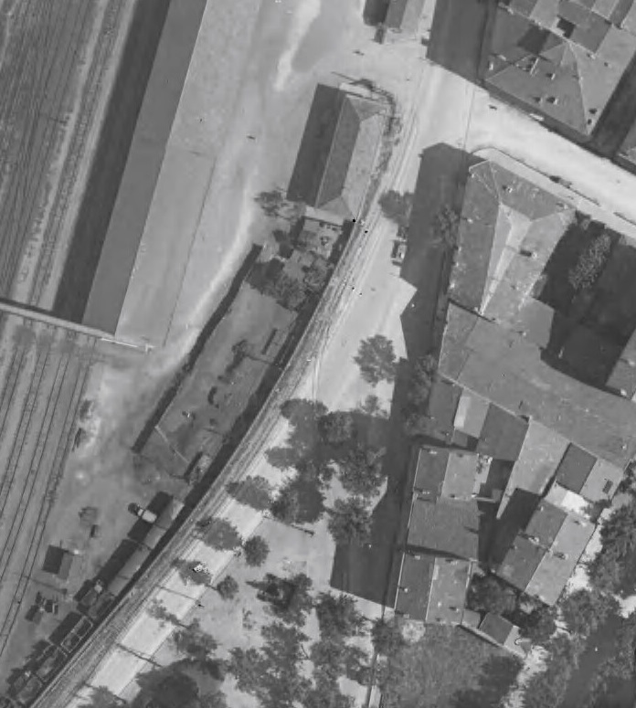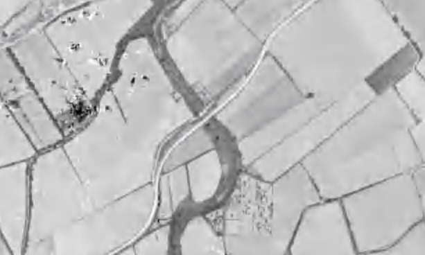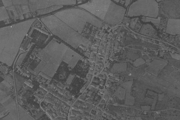This 1942 aerial image shows the station site at that time. The original buildings can be picked out – the engine shed, the passenger building and the goods office. There appears to be no sign of a mill-race. This suggests that the sketch plan of the station may erroneously include the river passing under the station. [4]