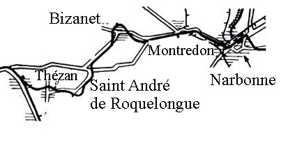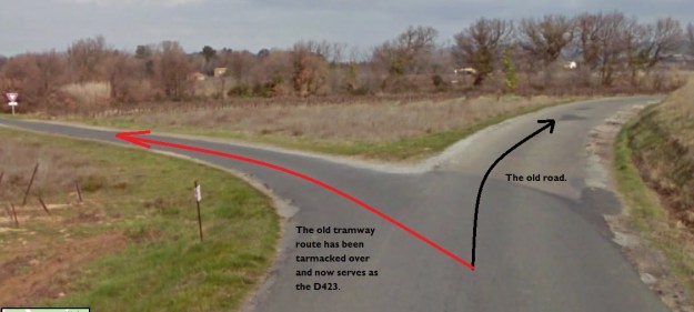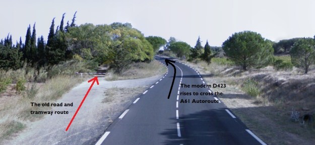 Joseph Pestell comments: “In all these years (40+!), I had never noticed that the caption on that photo of the bridge is wrong. The Petit Verdouble (usually a dry bed) is somewhat further east and does not intersect with the tramway until about a km further east at the junction for Nouvelles. That bridge is indeed over the watercourse (usually dry but a torrent in the 1999 floods) that takes you up past the Mas de Segur towards Palairac.” [22]