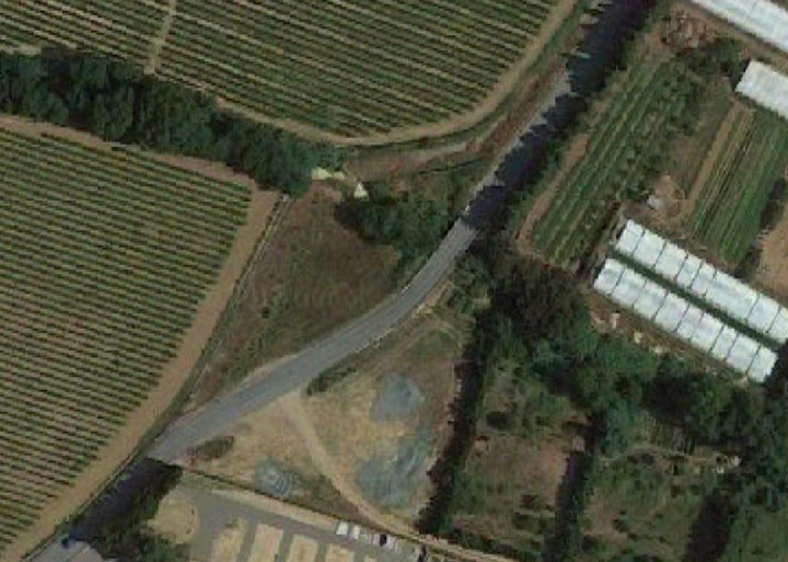 It is not clear whether the GC105 and/or the tramway were on the West or East side of the river. It is clear on the adjacent aerial image that the road from Nouvelles crossed the River in an East-West direction and then turned south to meet the modern road alignment to the Southwest of the modern bridge at the location shown in the image above. In the image below, the purple horizontal line on the map masks the location of the bridge on the line of the road to/from Nouvelles. [4]