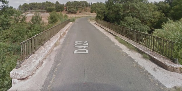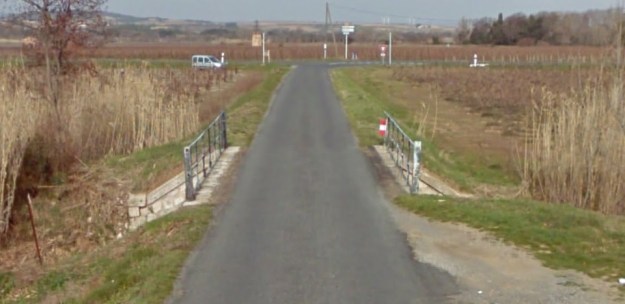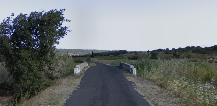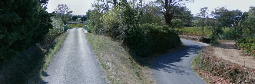 A Google Streetview image which shows the three bridges crossing the river bed in Villeneuve-les-Corbieres – this is taken from the far bank. The old village is ahead across the river and the tramway and GC105 were beyond.