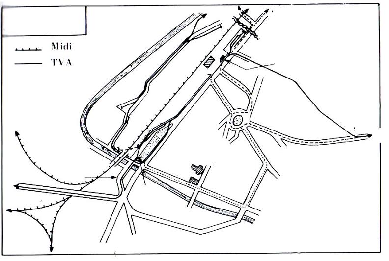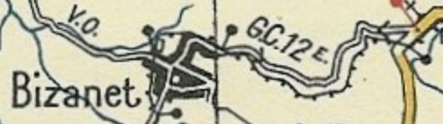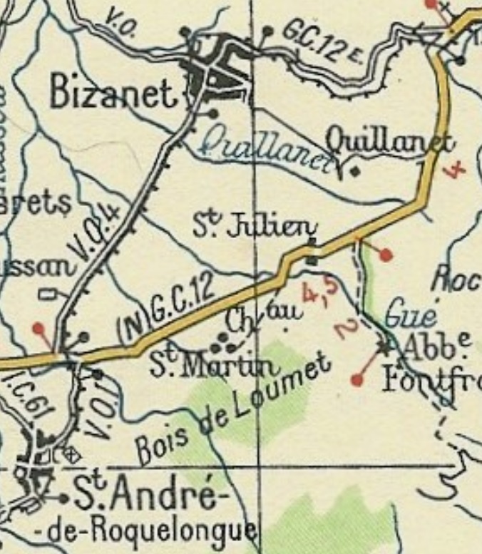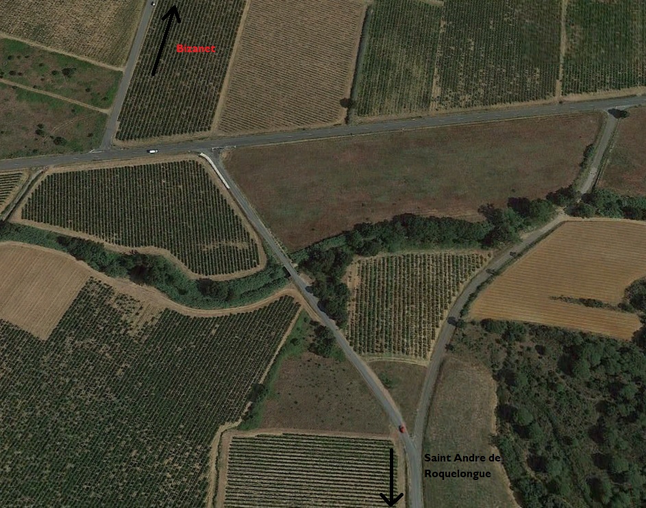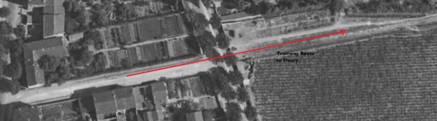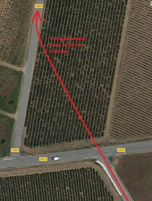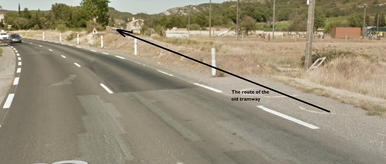 A counter argument is put by Joseph Pestel (26th October 2018), which given his residence close to the line is likely to be most reliable: “At Nouvelles (or rather at the road junction for Nouvelles), one can still see clearly (on the ground rather than with aerial photos) that the road used to stay on the right-hand (west) bank of the Petit Verdouble. There was a single bridge across to the road to Nouvelles. I don’t know at what date the road was widened and taken over two bridges (both washed away in 1999) to run for about 250M on the left-hand bank of the river. But I am sure that I have seen a pic of a halt at Nouvelles for the tramway on that side of the river. So my guess is that the road was diverted at the time the tramway was built. But not impossible that the road was moved after the tramway was built or even after closure which would explain the confusion on the Michelin map.” [22]