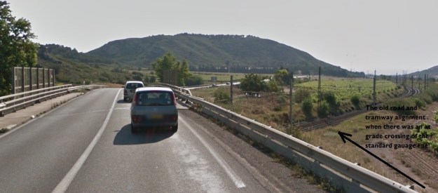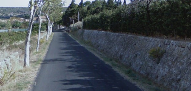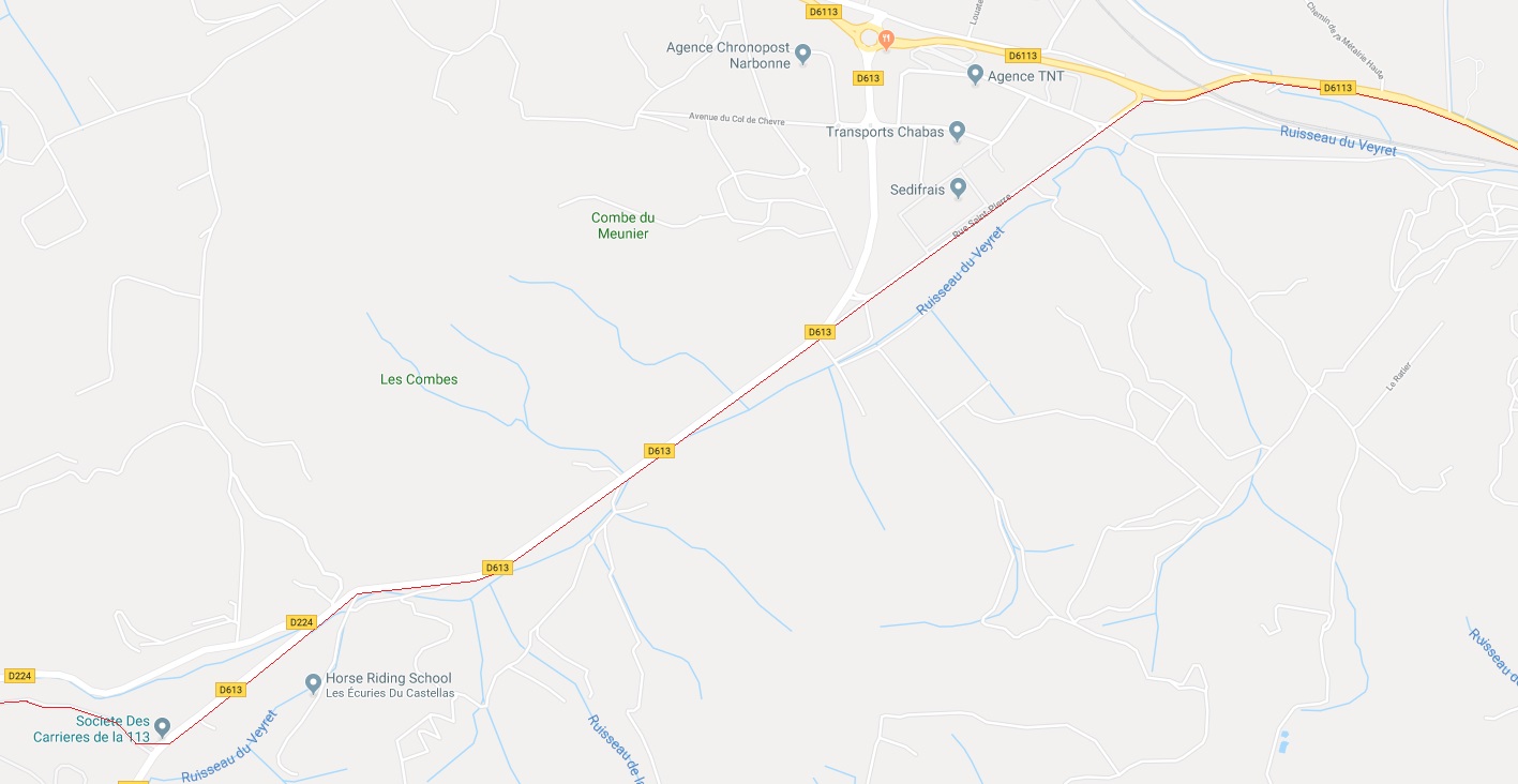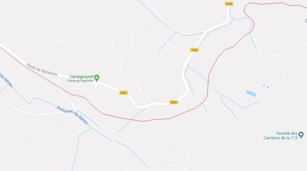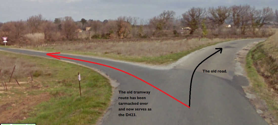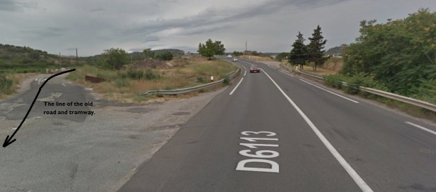 On the decent to Villeneuve-les-Corbieres the tramway switched to the western shoulder of the GC105. I could find little or no evidence of the tramway along this stretch of the modern D611, except perhaps some old bridge abutments! I guess the evidence is tenuous at best, but we do know that this was the route followed by the tram and that the tracks ran on the West side of the GC105 (D611), so it is just possible that the concrete blocks visible beyond the modern bridge railings below are remnants of the tramway?