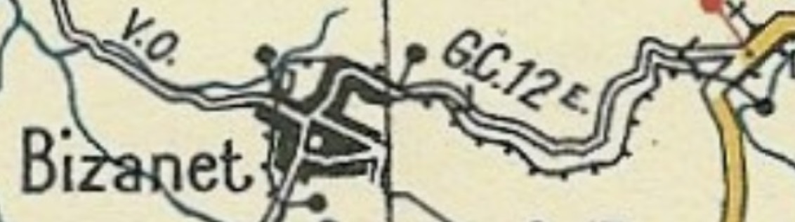 The route is confirmed on the adjacent 1930s Michelin Map which shows the line on the North shoulder of the ols GC105 between Villeneuve and Durban. The location of the station can also be picked out to the East of the village of Durban and on the North side of the GC105.