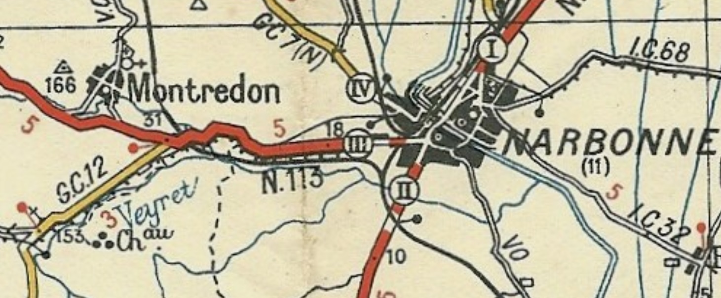 When the road and tramway reached Villeneuve-les-Corbieres they curved to the East through the old village centre. The Michelin map from the 1930s shows a small village on the South side of the River Berre. The village has extended across the river and the two banks of the river are linked by a series of bridges.