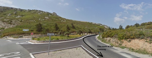The old road eventually was closed and the new D611 now runs through the old tramway tunnel. The satellite aerial image below is that the highest resolution possible, The image was taken in 1962 prior to the diversion of the road. [4]