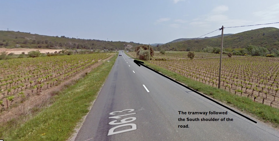 The first few kilometres Northest from Tuchan followed a gentle grade through vineyards with the trams running on the eastern shoulder of the GC105.