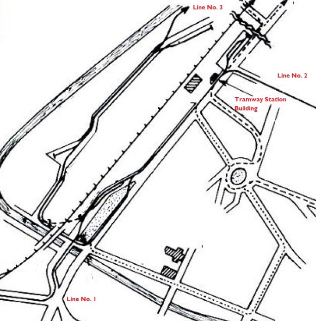 As the tramway approached the station at the west end of the narrower road alongside the river, the road widened out for a short distance. [13]