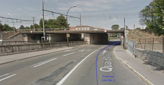 This view is taken from the West across the bridge over the Berre and shows the tramway tunnel portal. The GC105 turned to the right and followed the river. [16]