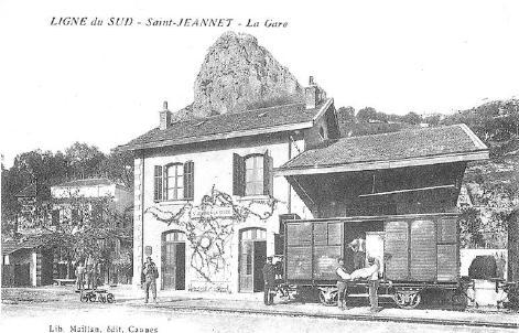 A quick nip up the Ancienne Route de Vence above the old line allows a glimpse of the old Saint-Jeannet station off to the right of the road. This accurately places the station on the map. The next image is a postcard of the station in the early 20th Century.