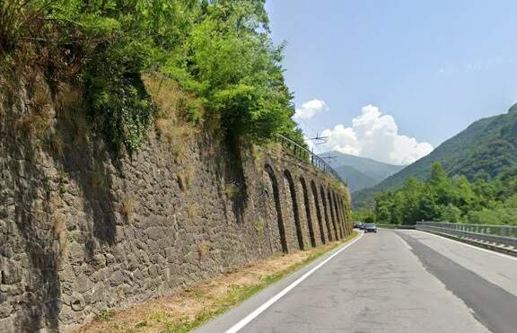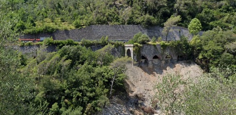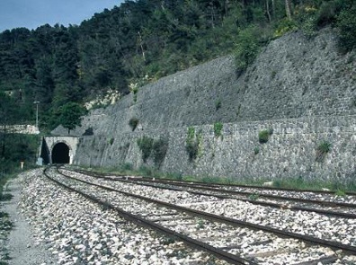 Immediately beyond the southern portal of the Ponte Nuovo Tunnel, a masonry retaining wall supports the railway above the SS20/E74.