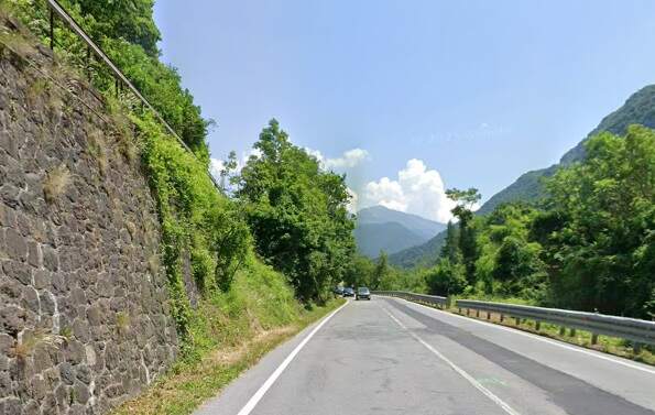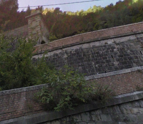 The southern portal of the Ponte Nuovo Tunnel is at the far end of this retaining wall. Immediately at the Southeast end of the retaining wall is the short Brunet Tunnel (161 metres long) [Google Streetview, June 2025]