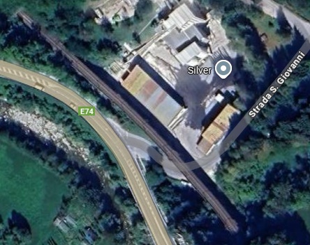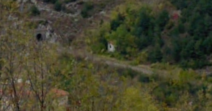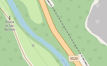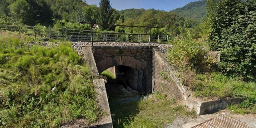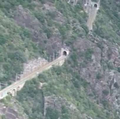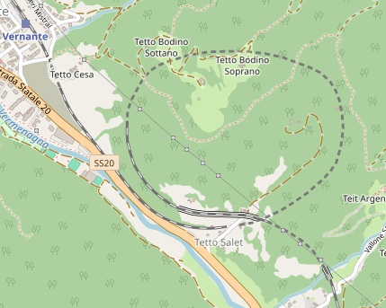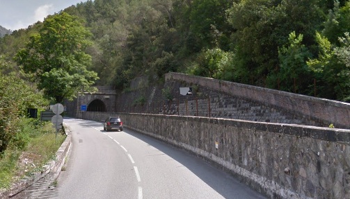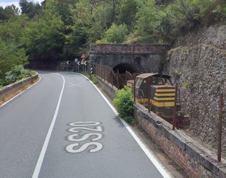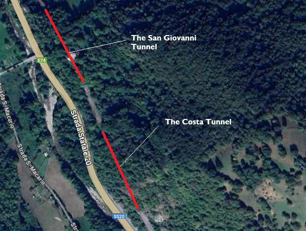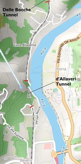 The Ponte Nuovo Tunnel: this extract from OpenStreetMap shows the tunnel curving significantly. It ran from just to the South of the Rio Vermanera Viaduct to open out immediately adjacent to the SS20/E74 but at a higher level. [55]