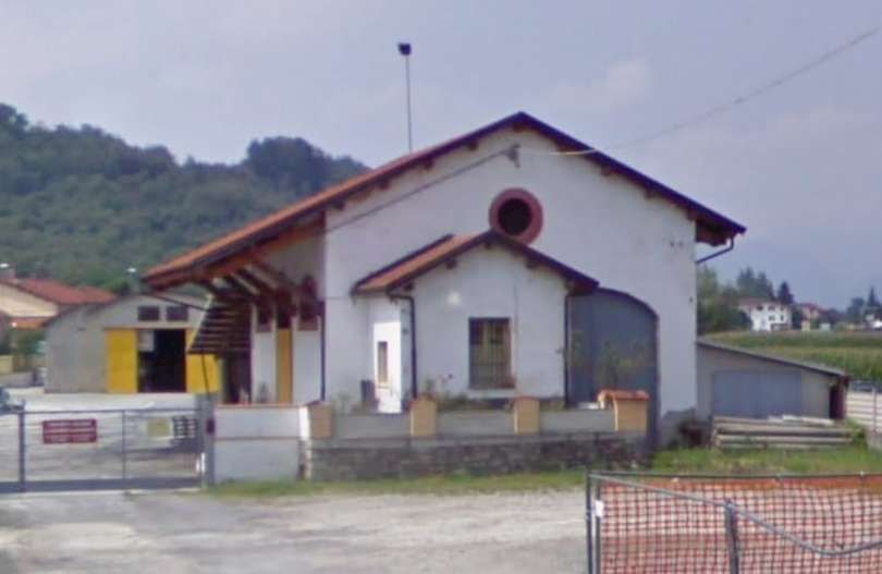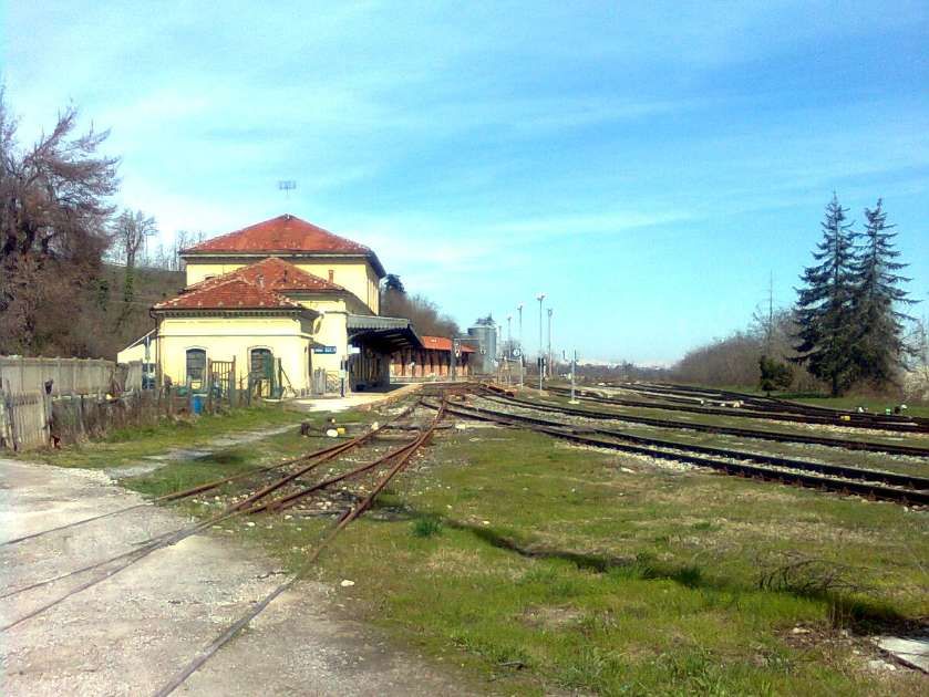 A station plan for the station at Robilante. The line is oriented Northwest to Southeast. The turntable is located at the Northwest end of the yard. The engine shed is opposite the passenger building. The goods shed was Northwest of the passenger facilities and is shown here with a single siding passing through the building. The bridge, shown in images below crosses the station throat at the Southeast end of the station site. Not shown on this early plan are five sidings added for clinker wagons from the Buzzi Unicem cement plant nearby. [47][53]