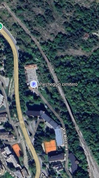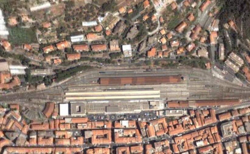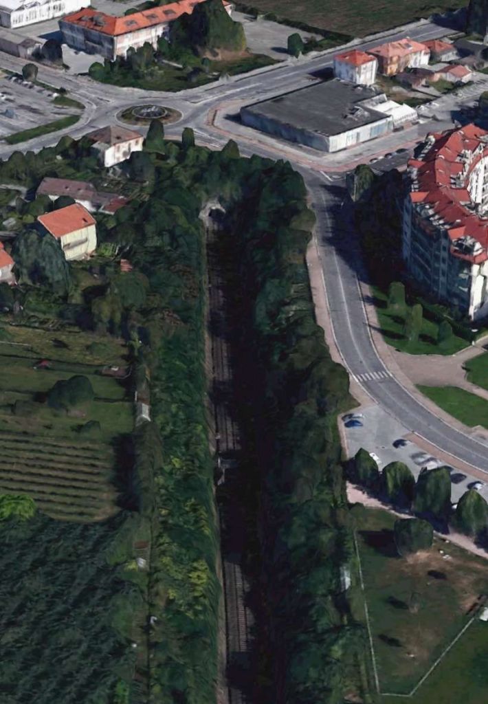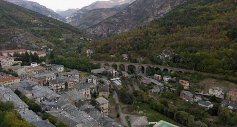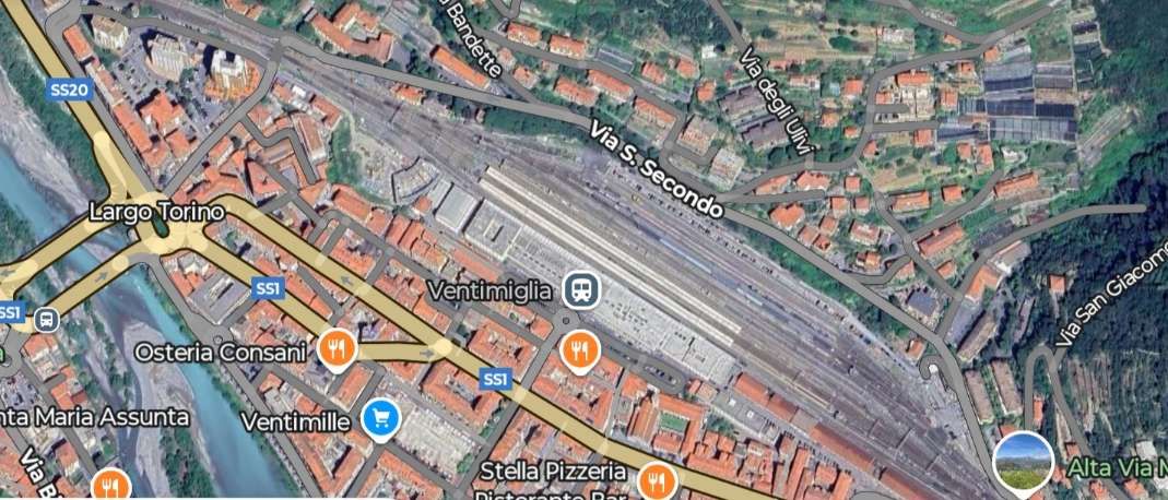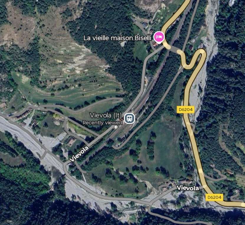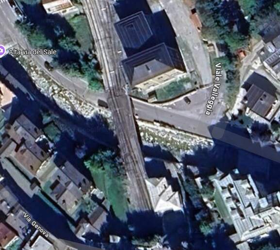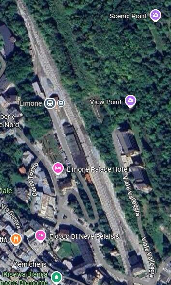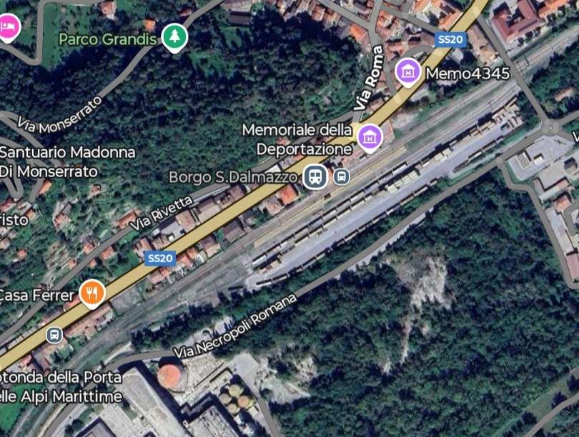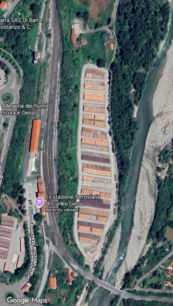 This satellite image shows the sharp curve from the Railway Station at Borgo San-Dalmazzo to the viaduct across the River Gesso. [Google Maps, July 2025]