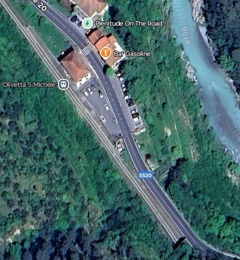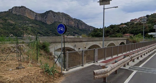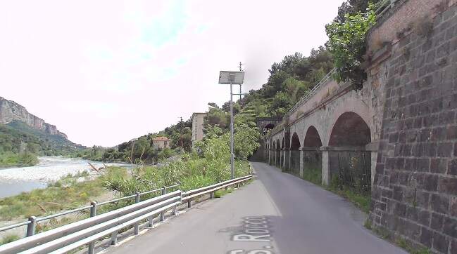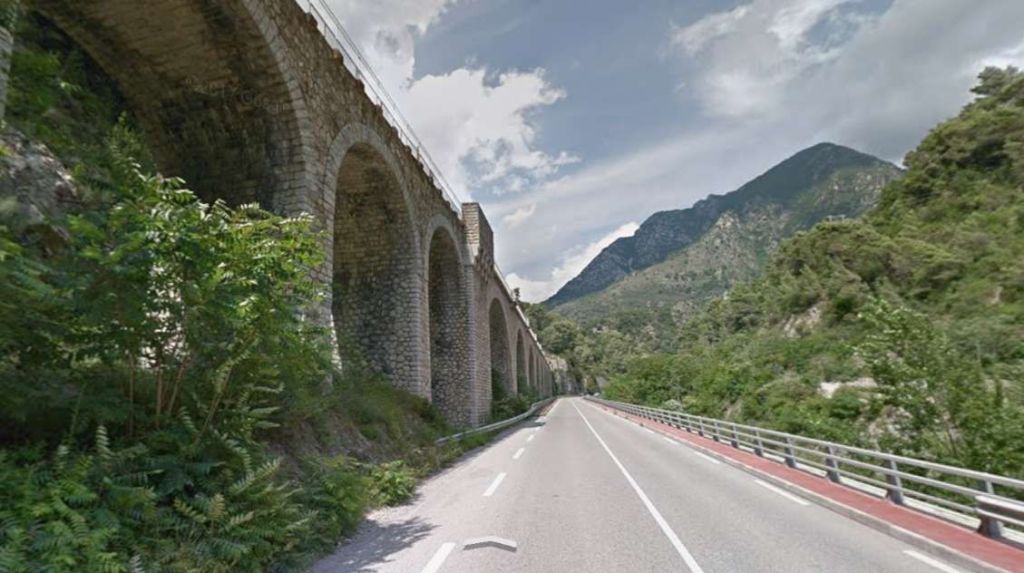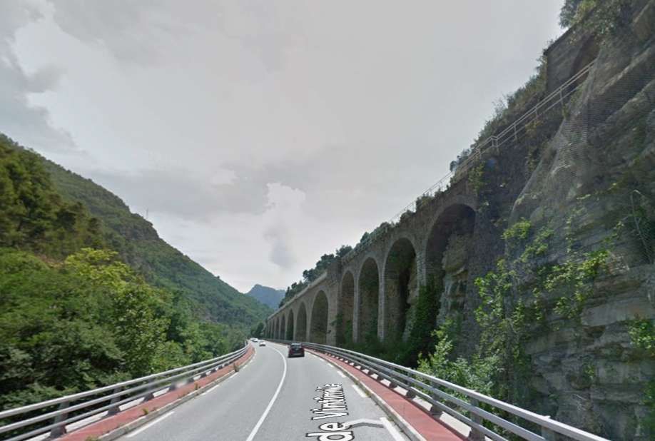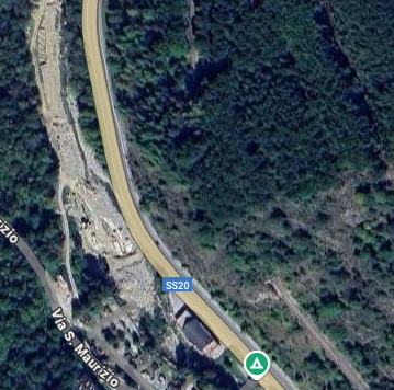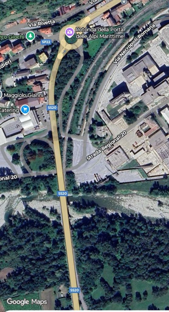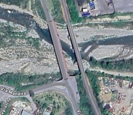 The 3-span viaduct across the River Gesso carries both the railway and the SS20. [Google Streetview, June 2025]Looking South along the SS20 as it crosses the Gesso. The railway cantenary is on the left with the tracks hidden behind the dividing fence. [Google Streetview, June 2025]