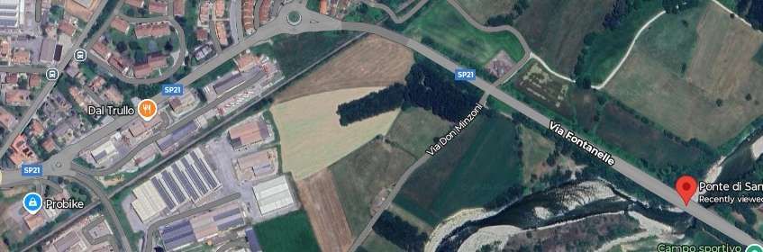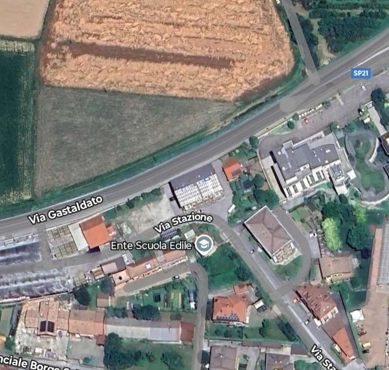 Also taken from the bridge carrying Via Sant’Andrea over the railway, this view looks across the road SP21 towards Borgo San-Dalmazzo. [Goog;e Streetview, May 2022]
