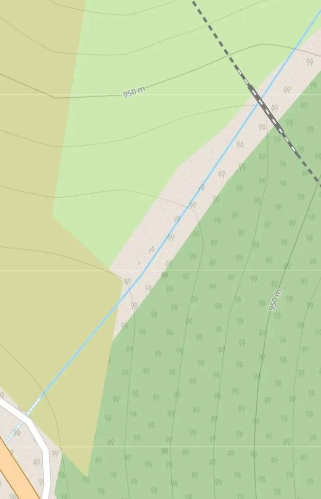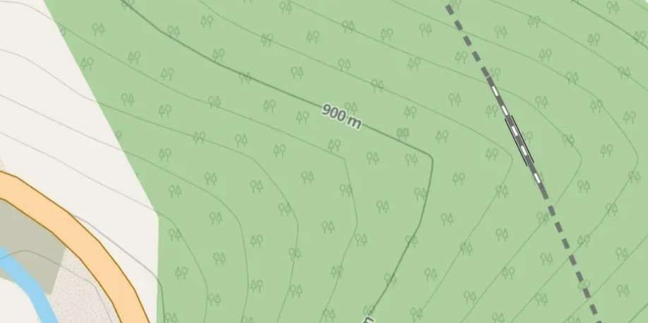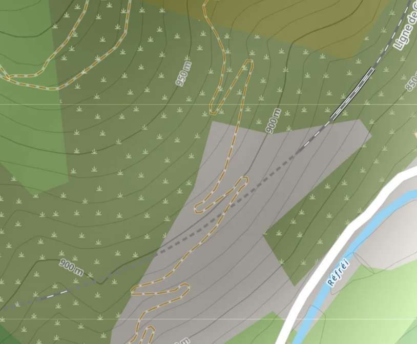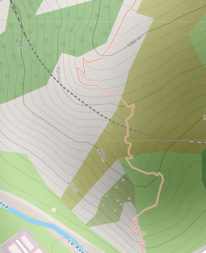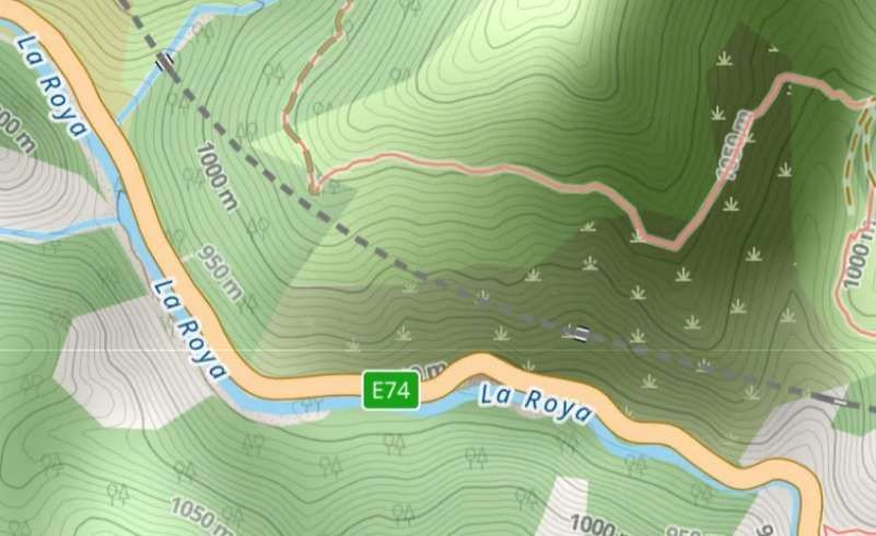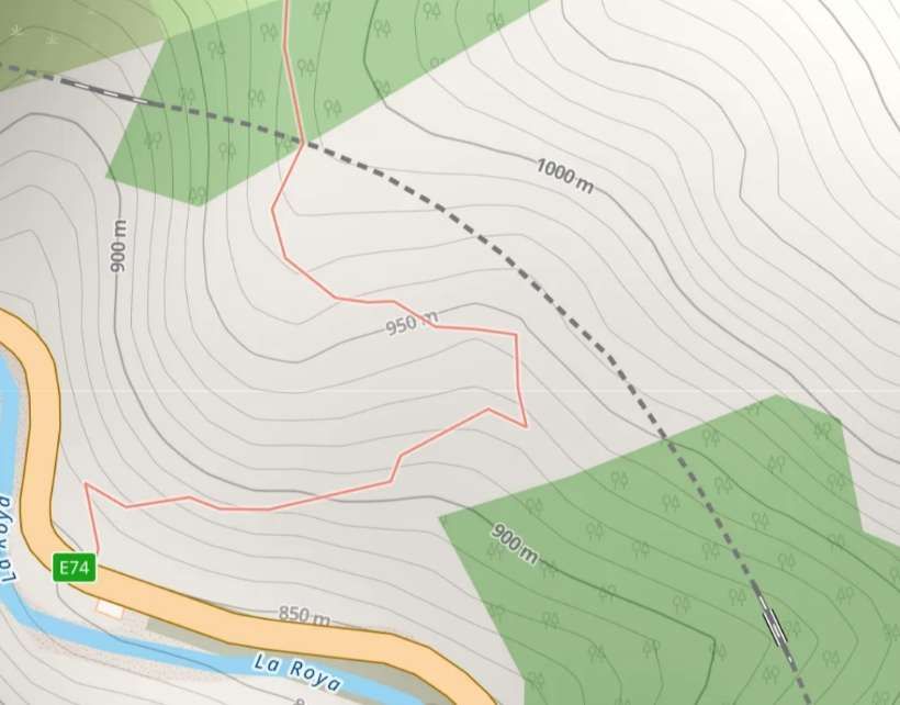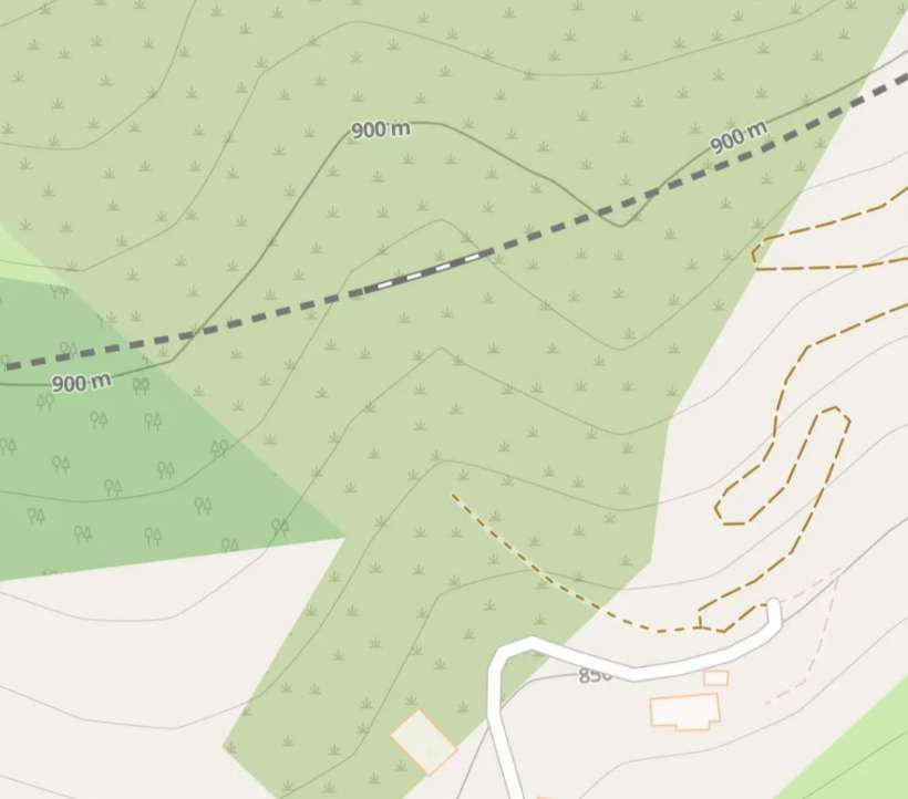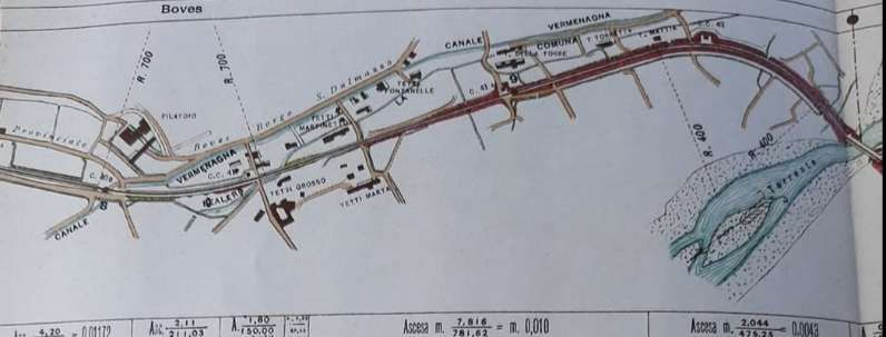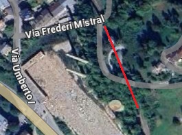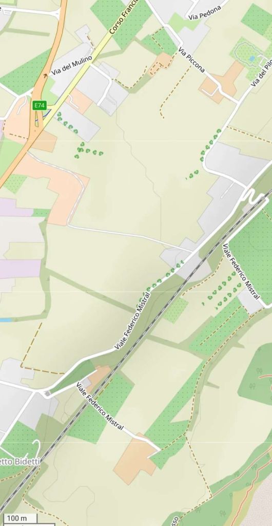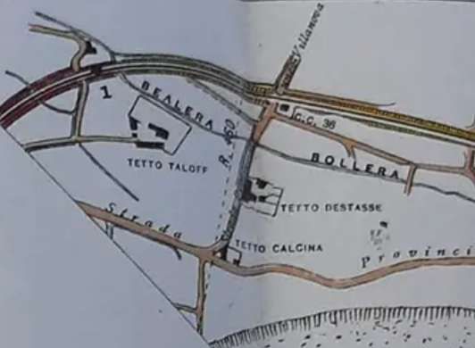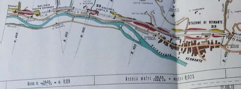 Now on a more Southwesterly course the line passes under a footbridge, obscured on the map extract by the words Tetto Bidetti in the top-right corne of the extract.