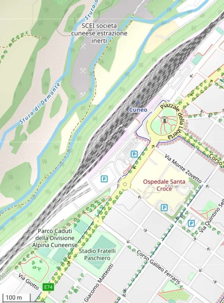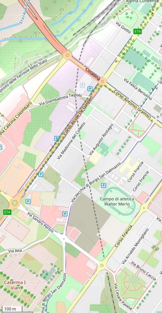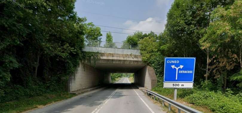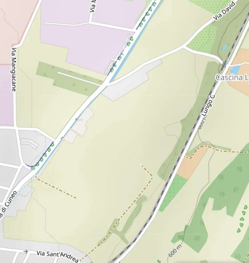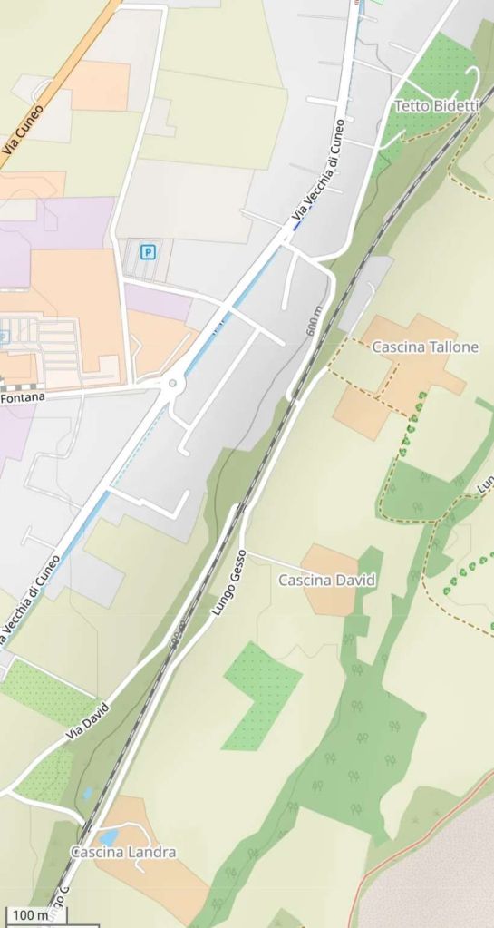 Via Sant’Andrea passes over the line. This view looks Northeast towards Cuneo. [Google Streetview, May 2022]