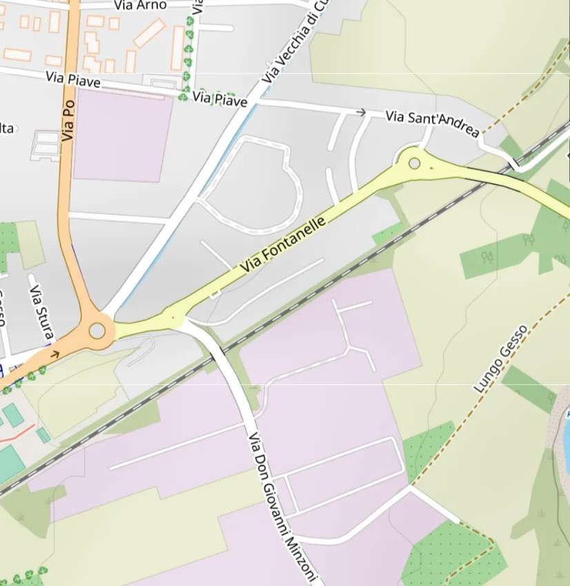 Close to Cascina Tallone, the line crosses Lungo Gesso by means of another brick ringed arch. This view looks under the railway from the Southeast. [Google Streetview, May 2022]