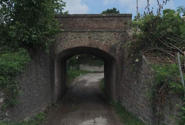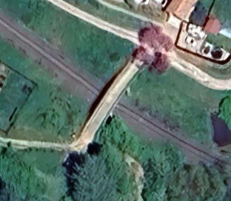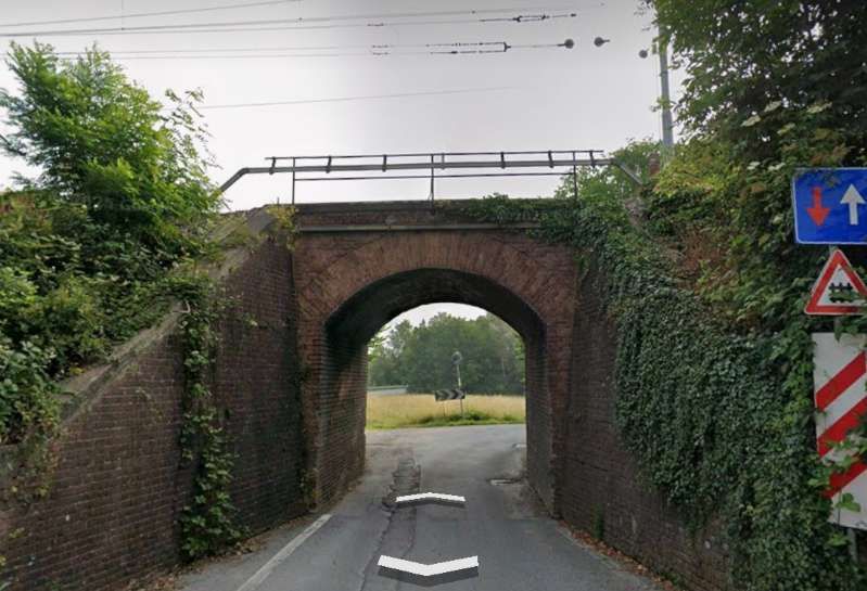 Near Cascina Landra another brick-arched bridge pierces the railway embankment. Again this view is from the Southeast on Via Sant’Andre. Thestructure appeasr bottom-left on the map extract above and top-right on the extract below. [Google Streetview, May 2022]