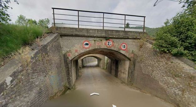 The line runs Northwest to Southeast across this extract from Google Maps satellite imagery. It runs close to the SP259 between Roccavione and Robilante. [Google Maps, July 2025]A link road under the railway and under the SP259 beyond. It provides access from Via Piano Sottano to the SP259. [Google Streetview, June 2025]What in the UK we might choose to call an underpass or cattle-creep under the railway. Apologies for the slight distortion of the image which comes from the way in which Google’s algorithm merges the 360° camera photographs. [Google Streetview, June 2025]
