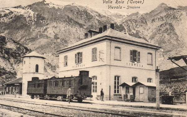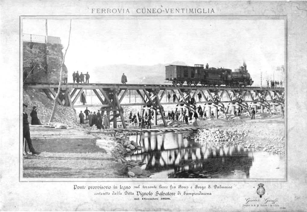 In 1887, the time had come for the first trains! “The Cuneo-Robilante section was inaugurated on Saturday, 16th July 1887, and opened for service on Monday 18th. Less than two weeks later, Francesco Crispi became President of the Council of Ministers, and relations between Italy and France would soon be strengthened. Then came the beginning of the future Cuneo-Mondovi line, which opened on 2nd October 1887, as far as Roccadebaldi. The Roccadebaldi and Robilante lines thus formed a common section for 359 meters, starting from Cuneo [Gesso] station and crossing the Gesso River on the same viaduct. … Two years later, the Robilante-Vernante section was … opened on 1st September 1889.” [1: p28]
