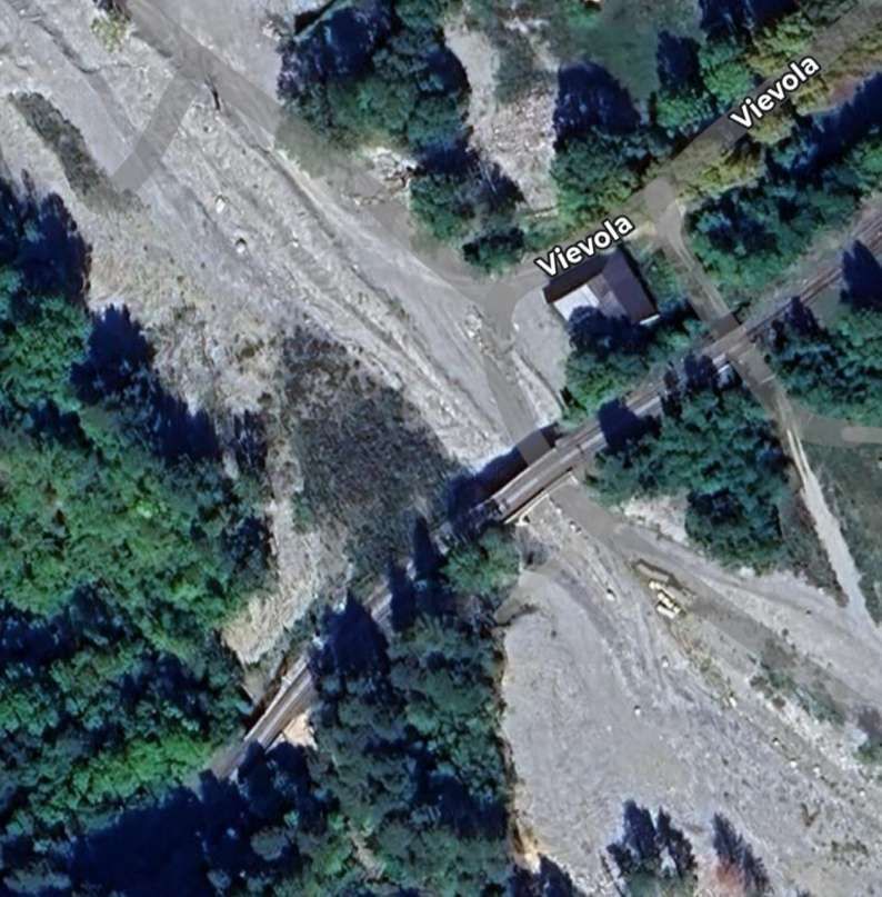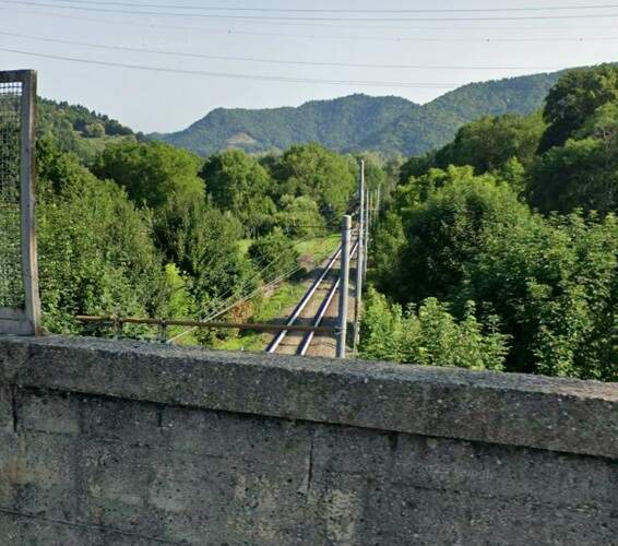 Looking North towards Robilante. [Google Streetview, June 2025]Looking ahead along the line towards the viaduct over the River Vermenagna. [Google Streetview, June 2025]The railway crossed the Vermenagna River by means of a viaduct of 5 arched spans – three of 21 metres flanked at each end by an 8 metre span. [Google Maps, July 2025][1: p27]