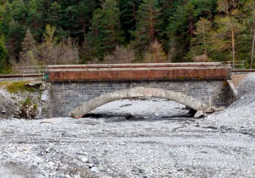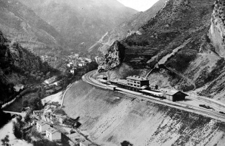 Burgo San-Dalmazzo to Robilante: The second construction contract covered the length from Borgo San-Dalmazzo to Robilante. Work began in late 1883. From Burgo San-Dalmazzo the line leaves the plain and begins its ascent up the Vermenagna Valley, heading towards the Tende Pass. The route, was designed to accommodate heavy traffic, so the line does “not include any curves with a radius less than 300 m, with two exceptions: one at the southern end of Cuneo station and one at the exit from Borgo station, where the route curves sharply to the left in a 257-meter curve to reach the left bank of the Gesso River. There, a 21 m three-arched masonry viaduct, shared by the railway and the SS20 road, crosses this Alpine torrent for the third and final time.” [1: p27]