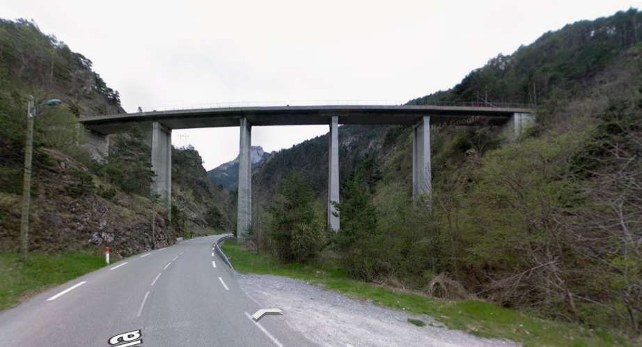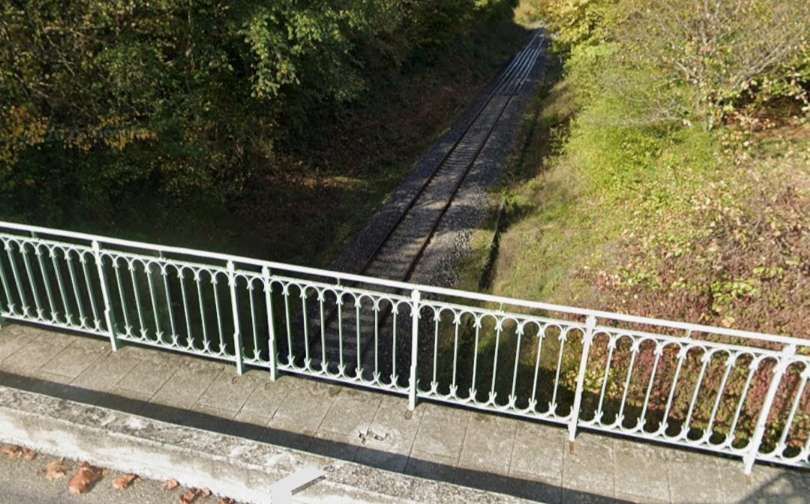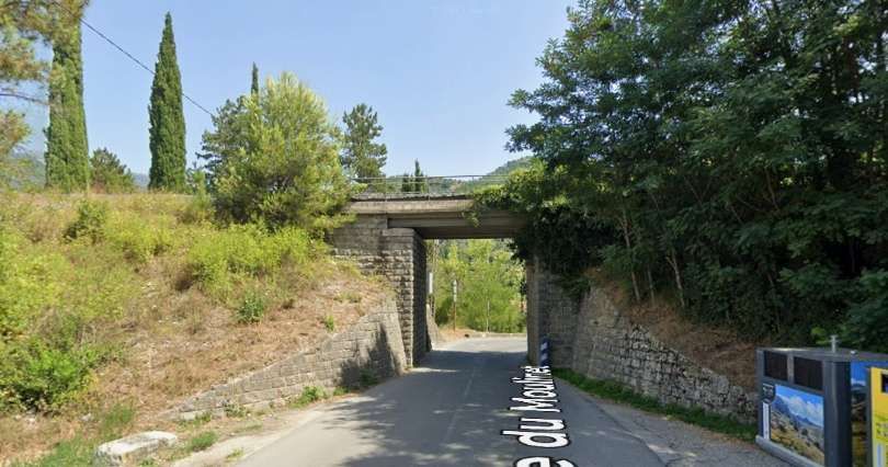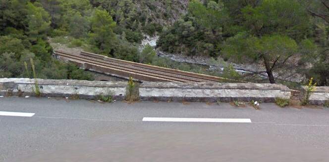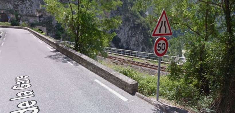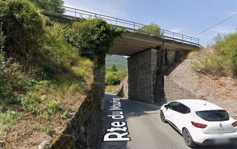 Looking North into the site of Drap-Cantaron Railway Station from the road bridge over the line. [Google Streetview, March 2025]The bridge over the line, seen from the Northwest. [Google Streetview, March 2025]Looking South from the same road bridge. [Google Streetview, March 2025]