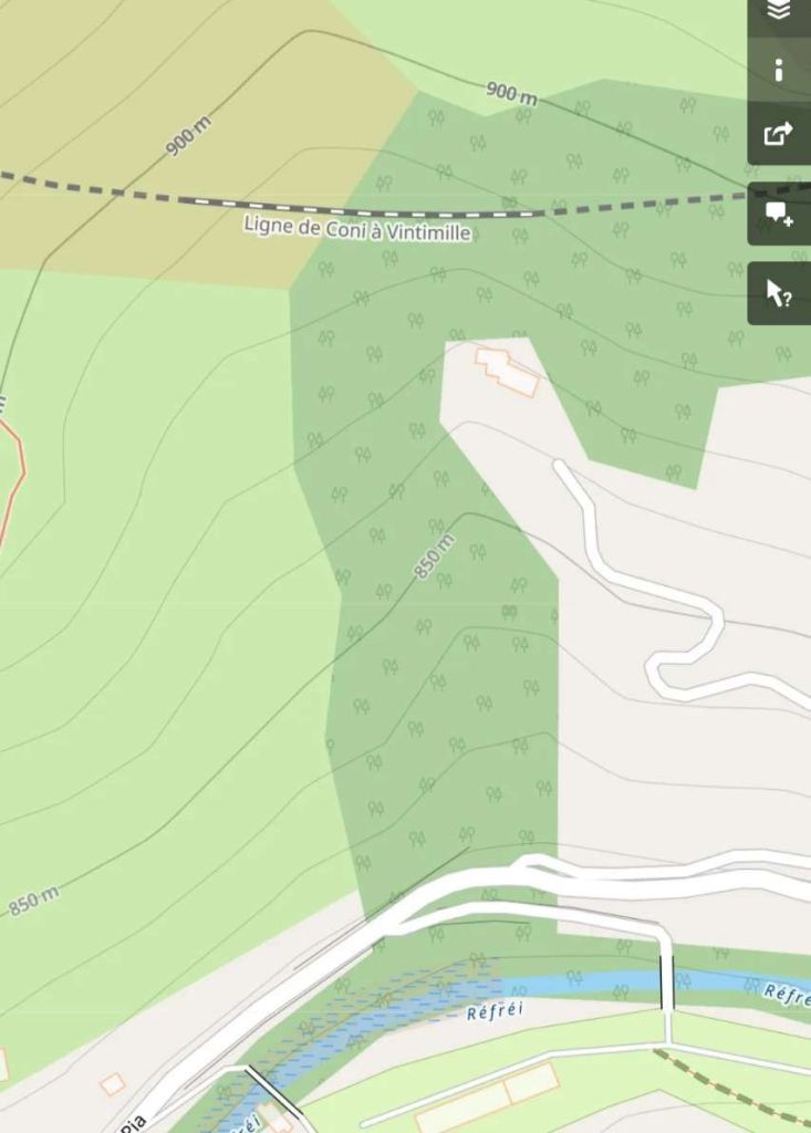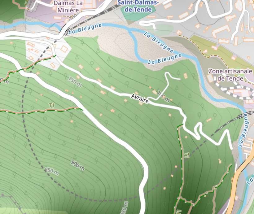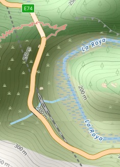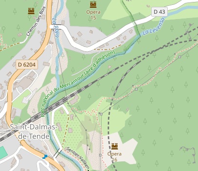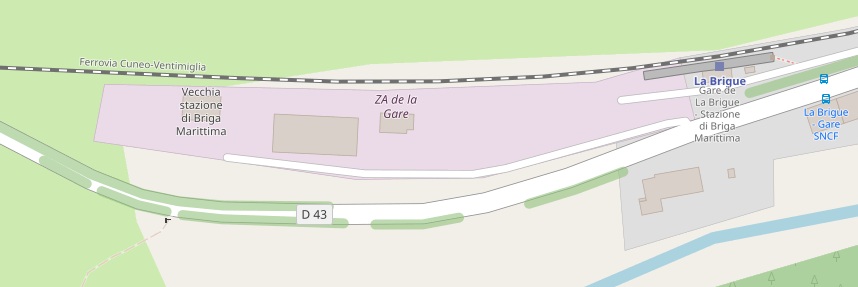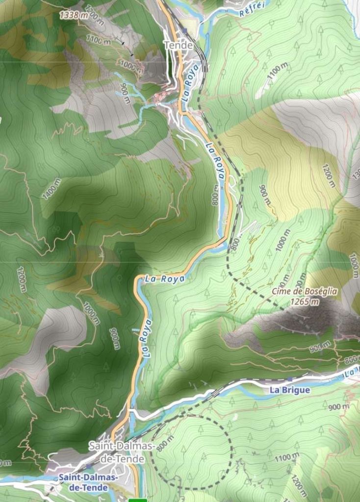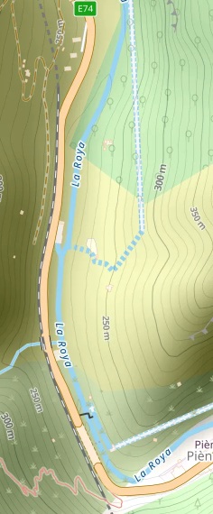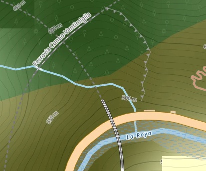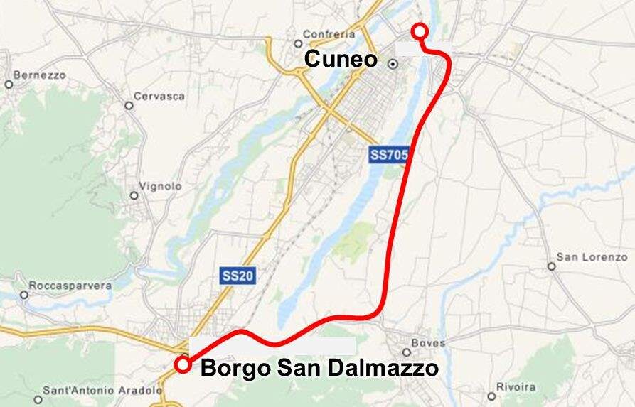 The line follows an easy gradient between the SP259 (which used to be the SS20) and the left bank of the River Vermenagna to Robilante Railway Station. [1: p27]